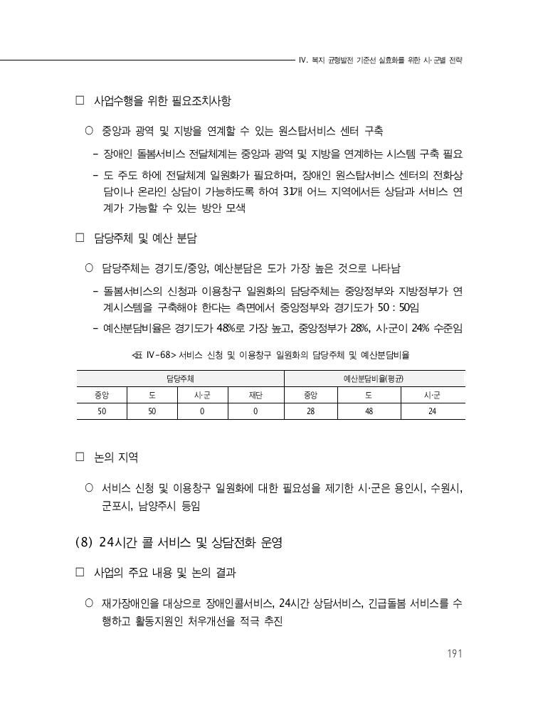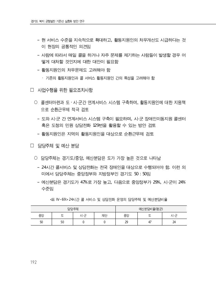 Ⅳ. 복지 균형발전 기준선 실효화를 위한 시·군별 전략 191 □ 사업수행을 위한 필요조치사항 ○ 중앙과 광역 및 지방을 연계할 수 있는 원스탑서비스 센터 구축 - 장애인 돌봄서비스 전달체계는 중앙과 광역 및 지방을 연계하는 시스템 구축 필요 - 도 주도 하에 전달체계 일원화가 필요하며, 장애인 원스탑서비스 센터의 전화상 담이나 온라인 상담이 가능하도록 하여 31개 어느 지역에서든 상담과 서비스 연 계가 가능할 수 있는 방안 모색 □ 담당주체 및 예산 분담 ○ 담당주체는 경기도/중앙, 예산분담은 도가 가장 높은 것으로 나타남 - 돌봄서비스의 신청과 이용창구 일원화의 담당주체는 중앙정부와 지방정부가 연 계시스템을 구축해야 한다는 측면에서 중앙정부와 경기도가 50:50임 - 예산분담비율은 경기도가 48%로 가장 높고, 중앙정부가 28%, 시·군이 24% 수준임 담당주체 예산분담비율(평균) 중앙 도 시·군 재단 중앙 도 시·군 50 50 0 0 28 48 24 <표 Ⅳ-68> 서비스 신청 및 이용창구 일원화의 담당주체 및 예산분담비율 □ 논의 지역 ○ 서비스 신청 및 이용창구 일원화에 대한 필요성을 제기한 시·군은 용인시, 수원시, 군포시, 남양주시 등임 (8) 24시간 콜 서비스 및 상담전화 운영 □ 사업의 주요 내용 및 논의 결과 ○ 재가장애인을 대상으로 장애인콜서비스, 24시간 상담서비스, 긴급돌봄 서비스를 수 행하고 활동지원인 처우개선을 적극 추진