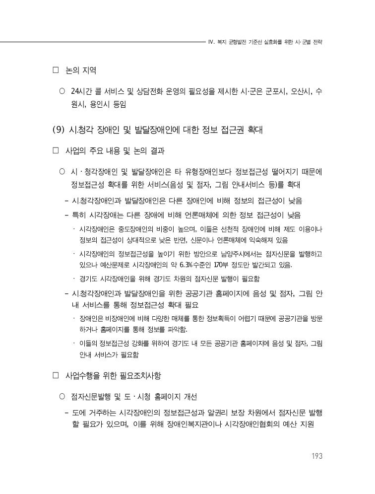 Ⅳ. 복지 균형발전 기준선 실효화를 위한 시·군별 전략 193 □ 논의 지역 ○ 24시간 콜 서비스 및 상담전화 운영의 필요성을 제시한 시·군은 군포시, 오산시, 수 원시, 용인시 등임 (9) 시․청각 장애인 및 발달장애인에 대한 정보 접근권 확대 □ 사업의 주요 내용 및 논의 결과 ○ 시・청각장애인 및 발달장애인은 타 유형장애인보다 정보접근성 떨어지기 때문에 정보접근성 확대를 위한 서비스(음성 및 점자, 그림 안내서비스 등)를 확대 - 시․청각장애인과 발달장애인은 다른 장애인에 비해 정보의 접근성이 낮음 - 특히 시각장애는 다른 장애에 비해 언론매체에 의한 정보 접근성이 낮음 ・ 시각장애인은 중도장애인의 비중이 높으며, 이들은 선천적 장애인에 비해 제도 이용이나 정보의 접근성이 상대적으로 낮은 반면, 신문이나 언론매체에 익숙해져 있음 ・ 시각장애인의 정보접근성을 높이기 위한 방안으로 남양주시에서는 점자신문을 발행하고 있으나 예산문제로 시각장애인의 약 6.3%수준인 170부 정도만 발간되고 있음. ・ 경기도 시각장애인을 위해 경기도 차원의 점자신문 발행이 필요함 - 시․청각장애인과 발달장애인을 위한 공공기관 홈페이지에 음성 및 점자, 그림 안 내 서비스를 통해 정보접근성 확대 필요 ・ 장애인은 비장애인에 비해 다양한 매체를 통한 정보획득이 어렵기 때문에 공공기관을 방문 하거나 홈페이지를 통해 정보를 파악함. ・ 이들의 정보접근성 강화를 위하여 경기도 내 모든 공공기관 홈페이지에 음성 및 점자, 그림 안내 서비스가 필요함 □ 사업수행을 위한 필요조치사항 ○ 점자신문발행 및 도・시청 홈페이지 개선 - 도에 거주하는 시각장애인의 정보접근성과 알권리 보장 차원에서 점자신문 발행 할 필요가 있으며, 이를 위해 장애인복지관이나 시각장애인협회의 예산 지원