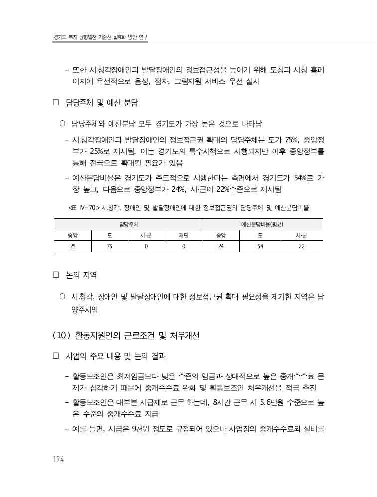 경기도 복지 균형발전 기준선 실효화 방안 연구 194 - 또한 시․청각장애인과 발달장애인의 정보접근성을 높이기 위해 도청과 시청 홈페 이지에 우선적으로 음성, 점자, 그림지원 서비스 우선 실시 □ 담당주체 및 예산 분담 ○ 담당주체와 예산분담 모두 경기도가 가장 높은 것으로 나타남 - 시․청각장애인과 발달장애인의 정보접근권 확대의 담당주체는 도가 75%, 중앙정 부가 25%로 제시됨. 이는 경기도의 특수시책으로 시행되지만 이후 중앙정부를 통해 전국으로 확대될 필요가 있음 - 예산분담비율은 경기도가 주도적으로 시행한다는 측면에서 경기도가 54%로 가 장 높고, 다음으로 중앙정부가 24%, 시·군이 22%수준으로 제시됨 담당주체 예산분담비율(평균) 중앙 도 시·군 재단 중앙 도 시·군 25 75 0 0 24 54 22 <표 Ⅳ-70> 시․청각, 장애인 및 발달장애인에 대한 정보접근권의 담당주체 및 예산분담비율 □ 논의 지역 ○ 시․청각, 장애인 및 발달장애인에 대한 정보접근권 확대 필요성을 제기한 지역은 남 양주시임 (10) 활동지원인의 근로조건 및 처우개선 □ 사업의 주요 내용 및 논의 결과 - 활동보조인은 최저임금보다 낮은 수준의 임금과 상대적으로 높은 중개수수료 문 제가 심각하기 때문에 중개수수료 완화 및 활동보조인 처우개선을 적극 추진 - 활동보조인은 대부분 시급제로 근무 하는데, 8시간 근무 시 5.6만원 수준으로 높 은 수준의 중개수수료 지급 - 예를 들면, 시급은 9천원 정도로 규정되어 있으나 사업장의 중개수수료와 실비를