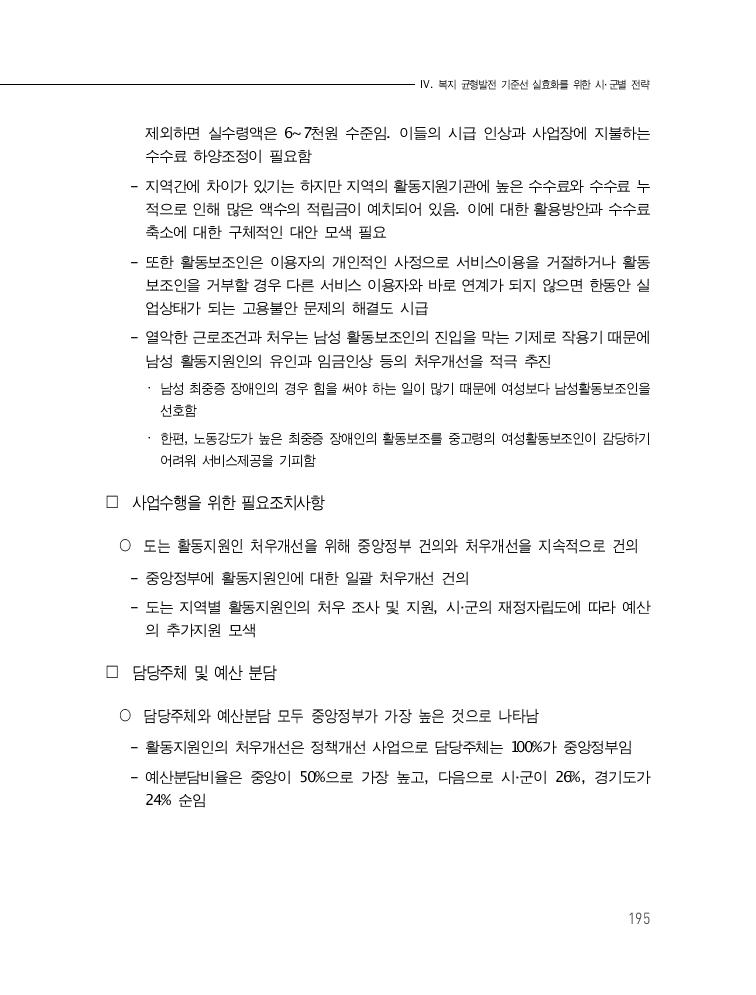 Ⅳ. 복지 균형발전 기준선 실효화를 위한 시·군별 전략 195 제외하면 실수령액은 6~7천원 수준임. 이들의 시급 인상과 사업장에 지불하는 수수료 하양조정이 필요함 - 지역간에 차이가 있기는 하지만 지역의 활동지원기관에 높은 수수료와 수수료 누 적으로 인해 많은 액수의 적립금이 예치되어 있음. 이에 대한 활용방안과 수수료 축소에 대한 구체적인 대안 모색 필요 - 또한 활동보조인은 이용자의 개인적인 사정으로 서비스이용을 거절하거나 활동 보조인을 거부할 경우 다른 서비스 이용자와 바로 연계가 되지 않으면 한동안 실 업상태가 되는 고용불안 문제의 해결도 시급 - 열악한 근로조건과 처우는 남성 활동보조인의 진입을 막는 기제로 작용기 때문에 남성 활동지원인의 유인과 임금인상 등의 처우개선을 적극 추진 ・ 남성 최중증 장애인의 경우 힘을 써야 하는 일이 많기 때문에 여성보다 남성활동보조인을 선호함 ・ 한편, 노동강도가 높은 최중증 장애인의 활동보조를 중고령의 여성활동보조인이 감당하기 어려워 서비스제공을 기피함 □ 사업수행을 위한 필요조치사항 ○ 도는 활동지원인 처우개선을 위해 중앙정부 건의와 처우개선을 지속적으로 건의 - 중앙정부에 활동지원인에 대한 일괄 처우개선 건의 - 도는 지역별 활동지원인의 처우 조사 및 지원, 시·군의 재정자립도에 따라 예산 의 추가지원 모색 □ 담당주체 및 예산 분담 ○ 담당주체와 예산분담 모두 중앙정부가 가장 높은 것으로 나타남 - 활동지원인의 처우개선은 정책개선 사업으로 담당주체는 100%가 중앙정부임 - 예산분담비율은 중앙이 50%으로 가장 높고, 다음으로 시·군이 26%, 경기도가 24% 순임