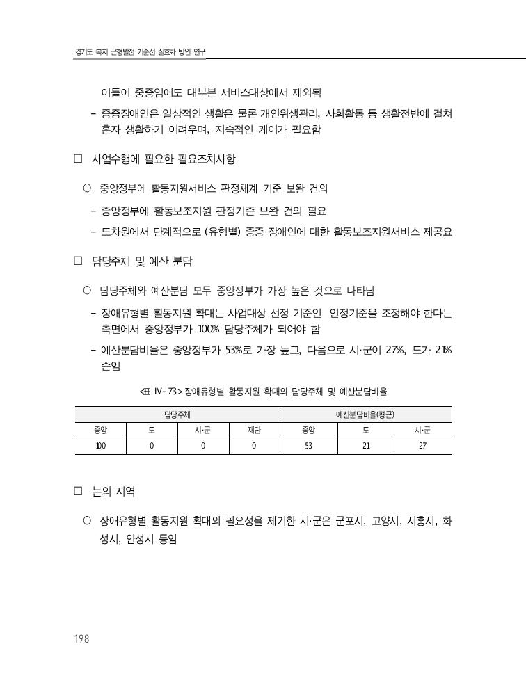 경기도 복지 균형발전 기준선 실효화 방안 연구 198 이들이 중증임에도 대부분 서비스대상에서 제외됨 - 중증장애인은 일상적인 생활은 물론 개인위생관리, 사회활동 등 생활전반에 걸쳐 혼자 생활하기 어려우며, 지속적인 케어가 필요함 □ 사업수행에 필요한 필요조치사항 ○ 중앙정부에 활동지원서비스 판정체계 기준 보완 건의 - 중앙정부에 활동보조지원 판정기준 보완 건의 필요 - 도차원에서 단계적으로 (유형별) 중증 장애인에 대한 활동보조지원서비스 제공요 □ 담당주체 및 예산 분담 ○ 담당주체와 예산분담 모두 중앙정부가 가장 높은 것으로 나타남 - 장애유형별 활동지원 확대는 사업대상 선정 기준인 인정기준을 조정해야 한다는 측면에서 중앙정부가 100% 담당주체가 되어야 함 - 예산분담비율은 중앙정부가 53%로 가장 높고, 다음으로 시·군이 27%, 도가 21% 순임 담당주체 예산분담비율(평균) 중앙 도 시·군 재단 중앙 도 시·군 100 0 0 0 53 21 27 <표 Ⅳ-73> 장애유형별 활동지원 확대의 담당주체 및 예산분담비율 □ 논의 지역 ○ 장애유형별 활동지원 확대의 필요성을 제기한 시·군은 군포시, 고양시, 시흥시, 화 성시, 안성시 등임
