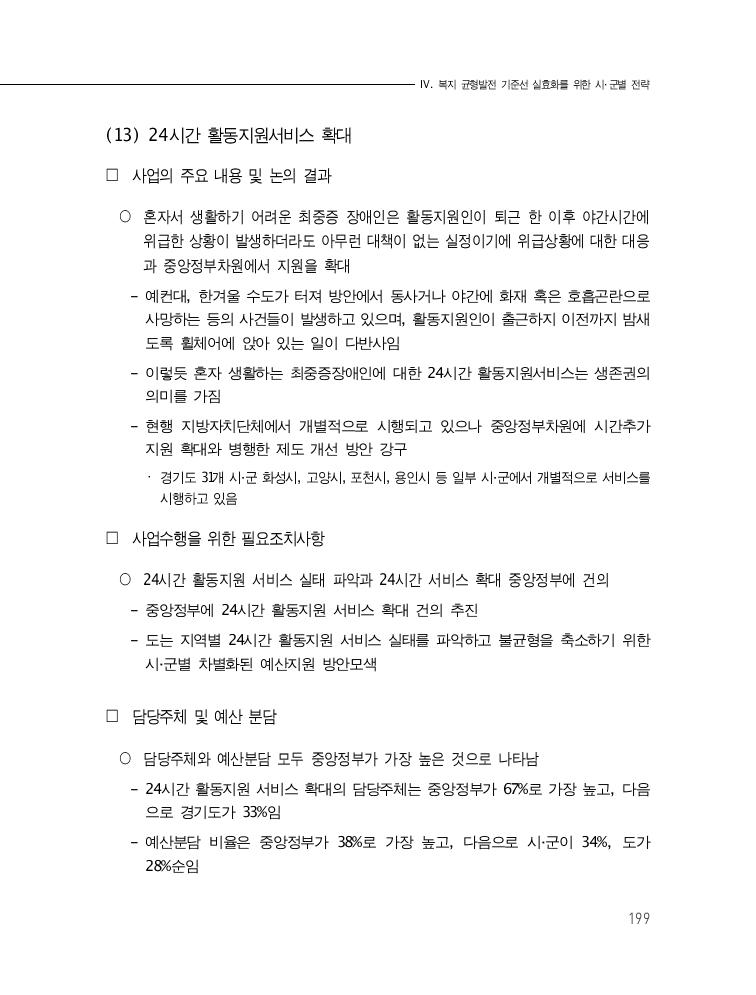 Ⅳ. 복지 균형발전 기준선 실효화를 위한 시·군별 전략 199 (13) 24시간 활동지원서비스 확대 □ 사업의 주요 내용 및 논의 결과 ○ 혼자서 생활하기 어려운 최중증 장애인은 활동지원인이 퇴근 한 이후 야간시간에 위급한 상황이 발생하더라도 아무런 대책이 없는 실정이기에 위급상황에 대한 대응 과 중앙정부차원에서 지원을 확대 - 예컨대, 한겨울 수도가 터져 방안에서 동사거나 야간에 화재 혹은 호흡곤란으로 사망하는 등의 사건들이 발생하고 있으며, 활동지원인이 출근하지 이전까지 밤새 도록 휠체어에 앉아 있는 일이 다반사임 - 이렇듯 혼자 생활하는 최중증장애인에 대한 24시간 활동지원서비스는 생존권의 의미를 가짐 - 현행 지방자치단체에서 개별적으로 시행되고 있으나 중앙정부차원에 시간추가 지원 확대와 병행한 제도 개선 방안 강구 ・ 경기도 31개 시·군 화성시, 고양시, 포천시, 용인시 등 일부 시·군에서 개별적으로 서비스를 시행하고 있음 □ 사업수행을 위한 필요조치사항 ○ 24시간 활동지원 서비스 실태 파악과 24시간 서비스 확대 중앙정부에 건의 - 중앙정부에 24시간 활동지원 서비스 확대 건의 추진 - 도는 지역별 24시간 활동지원 서비스 실태를 파악하고 불균형을 축소하기 위한 시·군별 차별화된 예산지원 방안모색 □ 담당주체 및 예산 분담 ○ 담당주체와 예산분담 모두 중앙정부가 가장 높은 것으로 나타남 - 24시간 활동지원 서비스 확대의 담당주체는 중앙정부가 67%로 가장 높고, 다음 으로 경기도가 33%임 - 예산분담 비율은 중앙정부가 38%로 가장 높고, 다음으로 시·군이 34%, 도가 28%순임