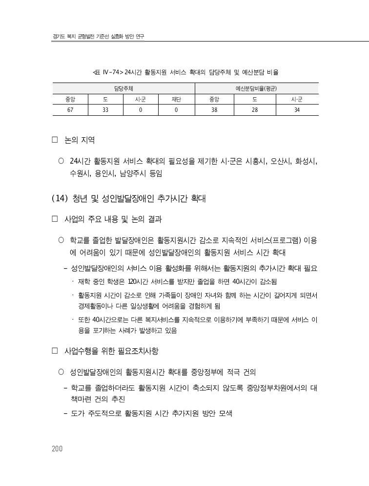 경기도 복지 균형발전 기준선 실효화 방안 연구 200 담당주체 예산분담비율(평균) 중앙 도 시·군 재단 중앙 도 시·군 67 33 0 0 38 28 34 <표 Ⅳ-74> 24시간 활동지원 서비스 확대의 담당주체 및 예산분담 비율 □ 논의 지역 ○ 24시간 활동지원 서비스 확대의 필요성을 제기한 시·군은 시흥시, 오산시, 화성시, 수원시, 용인시, 남양주시 등임 (14) 청년 및 성인발달장애인 추가시간 확대 □ 사업의 주요 내용 및 논의 결과 ○ 학교를 졸업한 발달장애인은 활동지원시간 감소로 지속적인 서비스(프로그램) 이용 에 어려움이 있기 때문에 성인발달장애인의 활동지원 서비스 시간 확대 - 성인발달장애인의 서비스 이용 활성화를 위해서는 활동지원의 추가시간 확대 필요 ・ 재학 중인 학생은 120시간 서비스를 받지만 졸업을 하면 40시간이 감소됨 ・ 활동지원 시간이 감소로 인해 가족들이 장애인 자녀와 함께 하는 시간이 길어지게 되면서 경제활동이나 다른 일상생활에 어려움을 경험하게 됨 ・ 또한 40시간으로는 다른 복지서비스를 지속적으로 이용하기에 부족하기 때문에 서비스 이 용을 포기하는 사례가 발생하고 있음 □ 사업수행을 위한 필요조치사항 ○ 성인발달장애인의 활동지원시간 확대를 중앙정부에 적극 건의 - 학교를 졸업하더라도 활동지원 시간이 축소되지 않도록 중앙정부차원에서의 대 책마련 건의 추진 - 도가 주도적으로 활동지원 시간 추가지원 방안 모색