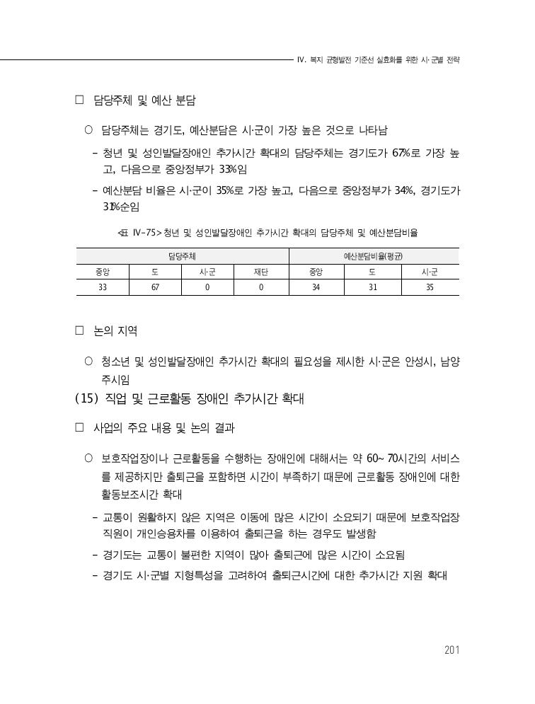 Ⅳ. 복지 균형발전 기준선 실효화를 위한 시·군별 전략 201 □ 담당주체 및 예산 분담 ○ 담당주체는 경기도, 예산분담은 시·군이 가장 높은 것으로 나타남 - 청년 및 성인발달장애인 추가시간 확대의 담당주체는 경기도가 67%로 가장 높 고, 다음으로 중앙정부가 33%임 - 예산분담 비율은 시·군이 35%로 가장 높고, 다음으로 중앙정부가 34%, 경기도가 31%순임 담당주체 예산분담비율(평균) 중앙 도 시·군 재단 중앙 도 시·군 33 67 0 0 34 31 35 <표 Ⅳ-75> 청년 및 성인발달장애인 추가시간 확대의 담당주체 및 예산분담비율 □ 논의 지역 ○ 청소년 및 성인발달장애인 추가시간 확대의 필요성을 제시한 시·군은 안성시, 남양 주시임 (15) 직업 및 근로활동 장애인 추가시간 확대 □ 사업의 주요 내용 및 논의 결과 ○ 보호작업장이나 근로활동을 수행하는 장애인에 대해서는 약 60~70시간의 서비스 를 제공하지만 출퇴근을 포함하면 시간이 부족하기 때문에 근로활동 장애인에 대한 활동보조시간 확대 - 교통이 원활하지 않은 지역은 이동에 많은 시간이 소요되기 때문에 보호작업장 직원이 개인승용차를 이용하여 출퇴근을 하는 경우도 발생함 - 경기도는 교통이 불편한 지역이 많아 출퇴근에 많은 시간이 소요됨 - 경기도 시·군별 지형특성을 고려하여 출퇴근시간에 대한 추가시간 지원 확대