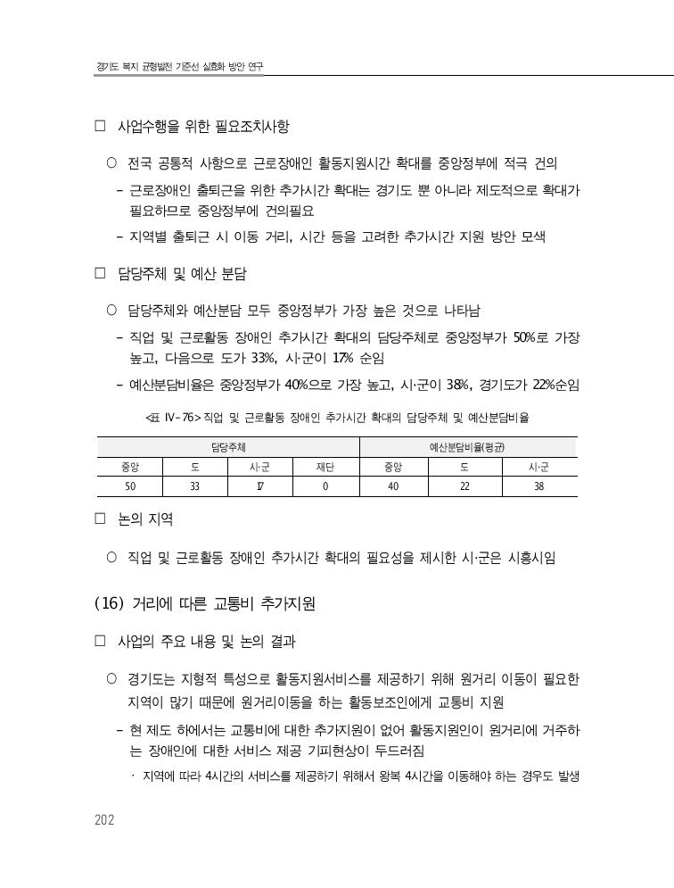 경기도 복지 균형발전 기준선 실효화 방안 연구 202 □ 사업수행을 위한 필요조치사항 ○ 전국 공통적 사항으로 근로장애인 활동지원시간 확대를 중앙정부에 적극 건의 - 근로장애인 출퇴근을 위한 추가시간 확대는 경기도 뿐 아니라 제도적으로 확대가 필요하므로 중앙정부에 건의필요 - 지역별 출퇴근 시 이동 거리, 시간 등을 고려한 추가시간 지원 방안 모색 □ 담당주체 및 예산 분담 ○ 담당주체와 예산분담 모두 중앙정부가 가장 높은 것으로 나타남 - 직업 및 근로활동 장애인 추가시간 확대의 담당주체로 중앙정부가 50%로 가장 높고, 다음으로 도가 33%, 시·군이 17% 순임 - 예산분담비율은 중앙정부가 40%으로 가장 높고, 시·군이 38%, 경기도가 22%순임 담당주체 예산분담비율(평균) 중앙 도 시·군 재단 중앙 도 시·군 50 33 17 0 40 22 38 <표 Ⅳ-76> 직업 및 근로활동 장애인 추가시간 확대의 담당주체 및 예산분담비율 □ 논의 지역 ○ 직업 및 근로활동 장애인 추가시간 확대의 필요성을 제시한 시·군은 시흥시임 (16) 거리에 따른 교통비 추가지원 □ 사업의 주요 내용 및 논의 결과 ○ 경기도는 지형적 특성으로 활동지원서비스를 제공하기 위해 원거리 이동이 필요한 지역이 많기 때문에 원거리이동을 하는 활동보조인에게 교통비 지원 - 현 제도 하에서는 교통비에 대한 추가지원이 없어 활동지원인이 원거리에 거주하 는 장애인에 대한 서비스 제공 기피현상이 두드러짐 ・ 지역에 따라 4시간의 서비스를 제공하기 위해서 왕복 4시간을 이동해야 하는 경우도 발생