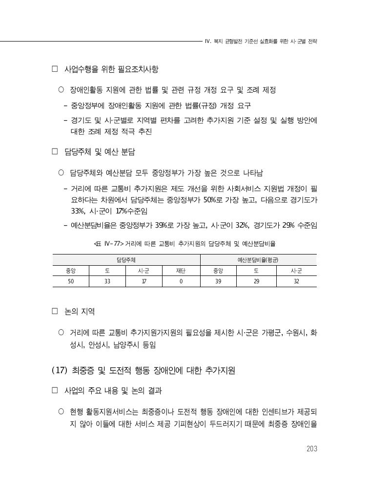Ⅳ. 복지 균형발전 기준선 실효화를 위한 시·군별 전략 203 □ 사업수행을 위한 필요조치사항 ○ 장애인활동 지원에 관한 법률 및 관련 규정 개정 요구 및 조례 제정 - 중앙정부에 장애인활동 지원에 관한 법률(규정) 개정 요구 - 경기도 및 시·군별로 지역별 편차를 고려한 추가지원 기준 설정 및 실행 방안에 대한 조례 제정 적극 추진 □ 담당주체 및 예산 분담 ○ 담당주체와 예산분담 모두 중앙정부가 가장 높은 것으로 나타남 - 거리에 따른 교통비 추가지원은 제도 개선을 위한 사회서비스 지원법 개정이 필 요하다는 차원에서 담당주체는 중앙정부가 50%로 가장 높고, 다음으로 경기도가 33%, 시·군이 17%수준임 - 예산분담비율은 중앙정부가 39%로 가장 높고, 시·군이 32%, 경기도가 29% 수준임 담당주체 예산분담비율(평균) 중앙 도 시·군 재단 중앙 도 시·군 50 33 17 0 39 29 32 <표 Ⅳ-77> 거리에 따른 교통비 추가지원의 담당주체 및 예산분담비율 □ 논의 지역 ○ 거리에 따른 교통비 추가지원가지원의 필요성을 제시한 시·군은 가평군, 수원시, 화 성시, 안성시, 남양주시 등임 (17) 최중증 및 도전적 행동 장애인에 대한 추가지원 □ 사업의 주요 내용 및 논의 결과 ○ 현행 활동지원서비스는 최중증이나 도전적 행동 장애인에 대한 인센티브가 제공되 지 않아 이들에 대한 서비스 제공 기피현상이 두드러지기 때문에 최중증 장애인을