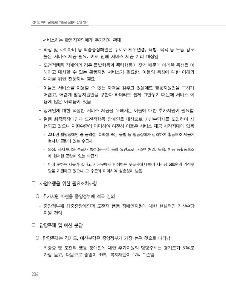 경기도 복지 균형발전 기준선 실효화 방안 연구 204 서비스하는 활동지원인에게 추가지원 확대 - 와상 및 사지마비 등 최중증장애인은 수시로 체위변경, 욕창, 목욕 등 노동 강도 높은 서비스 제공 필요. 이로 인해 서비스 제공 기피 대상임 - 도전적행동 장애인의 경우 돌발행동과 폭력행동이 잦기 때문에 이러한 특성을 이 해하고 대처할 수 있는 활동지원 서비스가 필요함. 이들의 특성에 대한 이해와 대처를 위한 전문지식 필요 - 이들은 서비스를 이용할 수 있는 자격을 갖추고 있음에도 활동지원인을 구하기 어렵고, 어렵게 활동지원인을 구한다 하더라도 쉽게 그만두기 때문에 서비스 이 용에 많은 어려움이 있음 - 장애인에 대한 적절한 서비스 제공을 위해서는 이들에 대한 추가지원이 필요함 - 현행 최중증장애인과 도전적행동 장애인을 대상으로 가산수당제를 도입하여 시 행되고 있으나 지원수준이 미미하여 여전히 이들은 서비스 제공 사각지대에 있음 ・ 2016년 발달장애인 중 공격성, 폭력성 또는 돌발 등 행동장애가 심각하여 활동보조 제공에 현저한 곤란이 있는 수급자 ・ 와상, 사지마비와 수급자 특성(몸무게) 등의 요인으로 대소변 처리, 목욕, 이동 등활동보조 에 현저한 곤란이 있는 수급자 ・ 이에 준하는 사유가 있다고 시․군구에서 인정하는 수급자에 대하여 시간당 680원의 가산수 당을 지원하고 있으나 그 수준이 미미하여 실효성이 낮음 □ 사업수행을 위한 필요조치사항 ○ 추가지원 마련을 중앙정부에 적극 건의 - 중앙정부에 최중증장애인과 도전적 행동 장애인지원에 대한 현실적인 가산수당 지원 건의 □ 담당주체 및 예산 분담 ○ 담당주체는 경기도, 예산분담은 중앙정부가 가장 높은 것으로 나타남 - 최중증 및 도전적 행동 장애인에 대한 추가지원의 담당주체는 경기도가 50%로 가장 높고, 다음으로 중앙이 33%, 복지재단이 17% 수준임