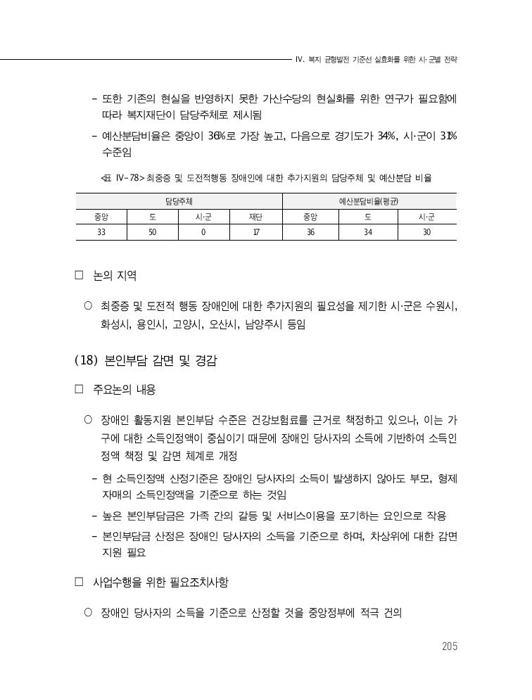 Ⅳ. 복지 균형발전 기준선 실효화를 위한 시·군별 전략 205 - 또한 기존의 현실을 반영하지 못한 가산수당의 현실화를 위한 연구가 필요함에 따라 복지재단이 담당주체로 제시됨 - 예산분담비율은 중앙이 36%로 가장 높고, 다음으로 경기도가 34%, 시·군이 31% 수준임 담당주체 예산분담비율(평균) 중앙 도 시·군 재단 중앙 도 시·군 33 50 0 17 36 34 30 <표 Ⅳ-78> 최중증 및 도전적행동 장애인에 대한 추가지원의 담당주체 및 예산분담 비율 □ 논의 지역 ○ 최중증 및 도전적 행동 장애인에 대한 추가지원의 필요성을 제기한 시·군은 수원시, 화성시, 용인시, 고양시, 오산시, 남양주시 등임 (18) 본인부담 감면 및 경감 □ 주요논의 내용 ○ 장애인 활동지원 본인부담 수준은 건강보험료를 근거로 책정하고 있으나, 이는 가 구에 대한 소득인정액이 중심이기 때문에 장애인 당사자의 소득에 기반하여 소득인 정액 책정 및 감면 체계로 개정 - 현 소득인정액 산정기준은 장애인 당사자의 소득이 발생하지 않아도 부모, 형제 자매의 소득인정액을 기준으로 하는 것임 - 높은 본인부담금은 가족 간의 갈등 및 서비스이용을 포기하는 요인으로 작용 - 본인부담금 산정은 장애인 당사자의 소득을 기준으로 하며, 차상위에 대한 감면 지원 필요 □ 사업수행을 위한 필요조치사항 ○ 장애인 당사자의 소득을 기준으로 산정할 것을 중앙정부에 적극 건의