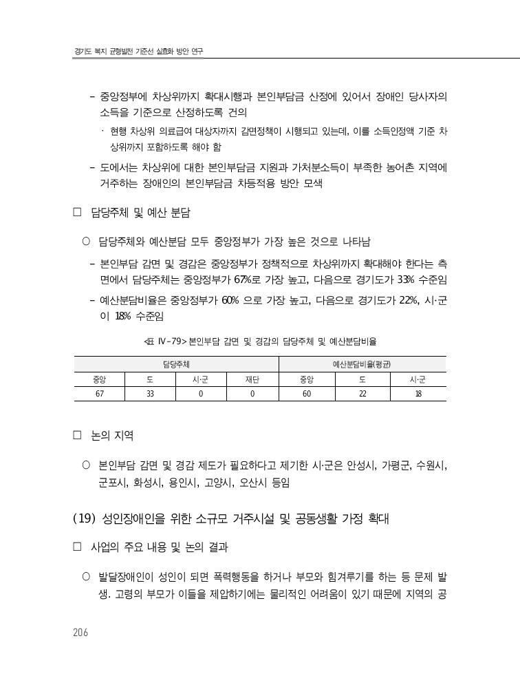 경기도 복지 균형발전 기준선 실효화 방안 연구 206 - 중앙정부에 차상위까지 확대시행과 본인부담금 산정에 있어서 장애인 당사자의 소득을 기준으로 산정하도록 건의 ・ 현행 차상위 의료급여 대상자까지 감면정책이 시행되고 있는데, 이를 소득인정액 기준 차 상위까지 포함하도록 해야 함 - 도에서는 차상위에 대한 본인부담금 지원과 가처분소득이 부족한 농어촌 지역에 거주하는 장애인의 본인부담금 차등적용 방안 모색 □ 담당주체 및 예산 분담 ○ 담당주체와 예산분담 모두 중앙정부가 가장 높은 것으로 나타남 - 본인부담 감면 및 경감은 중앙정부가 정책적으로 차상위까지 확대해야 한다는 측 면에서 담당주체는 중앙정부가 67%로 가장 높고, 다음으로 경기도가 33% 수준임 - 예산분담비율은 중앙정부가 60% 으로 가장 높고, 다음으로 경기도가 22%, 시·군 이 18% 수준임 담당주체 예산분담비율(평균) 중앙 도 시·군 재단 중앙 도 시·군 67 33 0 0 60 22 18 <표 Ⅳ-79> 본인부담 감면 및 경감의 담당주체 및 예산분담비율 □ 논의 지역 ○ 본인부담 감면 및 경감 제도가 필요하다고 제기한 시·군은 안성시, 가평군, 수원시, 군포시, 화성시, 용인시, 고양시, 오산시 등임 (19) 성인장애인을 위한 소규모 거주시설 및 공동생활 가정 확대 □ 사업의 주요 내용 및 논의 결과 ○ 발달장애인이 성인이 되면 폭력행동을 하거나 부모와 힘겨루기를 하는 등 문제 발 생. 고령의 부모가 이들을 제압하기에는 물리적인 어려움이 있기 때문에 지역의 공
