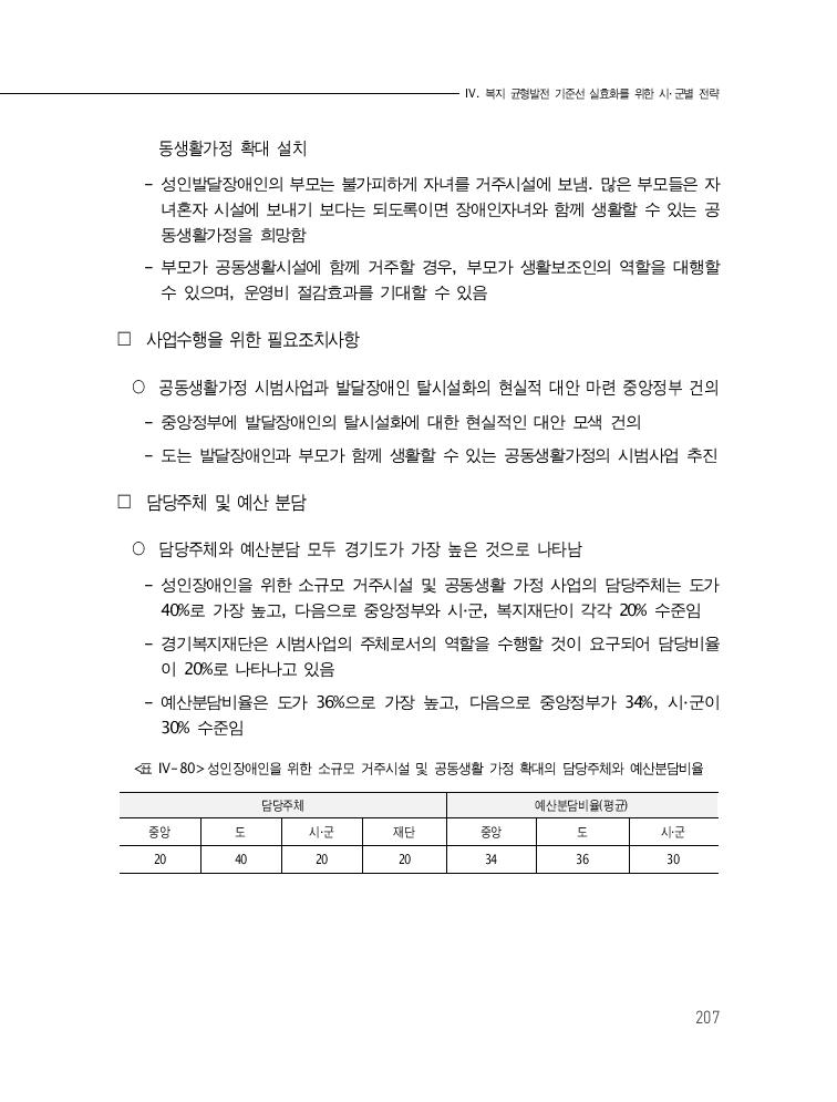 Ⅳ. 복지 균형발전 기준선 실효화를 위한 시·군별 전략 207 동생활가정 확대 설치 - 성인발달장애인의 부모는 불가피하게 자녀를 거주시설에 보냄. 많은 부모들은 자 녀혼자 시설에 보내기 보다는 되도록이면 장애인자녀와 함께 생활할 수 있는 공 동생활가정을 희망함 - 부모가 공동생활시설에 함께 거주할 경우, 부모가 생활보조인의 역할을 대행할 수 있으며, 운영비 절감효과를 기대할 수 있음 □ 사업수행을 위한 필요조치사항 ○ 공동생활가정 시범사업과 발달장애인 탈시설화의 현실적 대안 마련 중앙정부 건의 - 중앙정부에 발달장애인의 탈시설화에 대한 현실적인 대안 모색 건의 - 도는 발달장애인과 부모가 함께 생활할 수 있는 공동생활가정의 시범사업 추진 □ 담당주체 및 예산 분담 ○ 담당주체와 예산분담 모두 경기도가 가장 높은 것으로 나타남 - 성인장애인을 위한 소규모 거주시설 및 공동생활 가정 사업의 담당주체는 도가 40%로 가장 높고, 다음으로 중앙정부와 시·군, 복지재단이 각각 20% 수준임 - 경기복지재단은 시범사업의 주체로서의 역할을 수행할 것이 요구되어 담당비율 이 20%로 나타나고 있음 - 예산분담비율은 도가 36%으로 가장 높고, 다음으로 중앙정부가 34%, 시·군이 30% 수준임 담당주체 예산분담비율(평균) 중앙 도 시·군 재단 중앙 도 시·군 20 40 20 20 34 36 30 <표 Ⅳ-80> 성인장애인을 위한 소규모 거주시설 및 공동생활 가정 확대의 담당주체와 예산분담비율