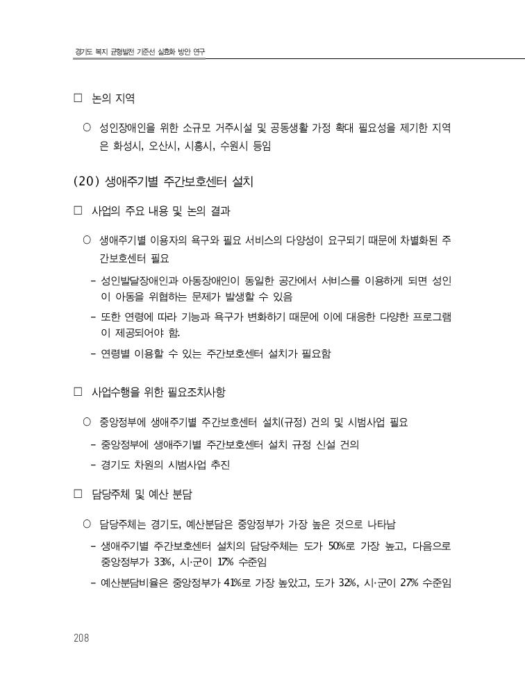 경기도 복지 균형발전 기준선 실효화 방안 연구 208 □ 논의 지역 ○ 성인장애인을 위한 소규모 거주시설 및 공동생활 가정 확대 필요성을 제기한 지역 은 화성시, 오산시, 시흥시, 수원시 등임 (20) 생애주기별 주간보호센터 설치 □ 사업의 주요 내용 및 논의 결과 ○ 생애주기별 이용자의 욕구와 필요 서비스의 다양성이 요구되기 때문에 차별화된 주 간보호센터 필요 - 성인발달장애인과 아동장애인이 동일한 공간에서 서비스를 이용하게 되면 성인 이 아동을 위협하는 문제가 발생할 수 있음 - 또한 연령에 따라 기능과 욕구가 변화하기 때문에 이에 대응한 다양한 프로그램 이 제공되어야 함. - 연령별 이용할 수 있는 주간보호센터 설치가 필요함 □ 사업수행을 위한 필요조치사항 ○ 중앙정부에 생애주기별 주간보호센터 설치(규정) 건의 및 시범사업 필요 - 중앙정부에 생애주기별 주간보호센터 설치 규정 신설 건의 - 경기도 차원의 시범사업 추진 □ 담당주체 및 예산 분담 ○ 담당주체는 경기도, 예산분담은 중앙정부가 가장 높은 것으로 나타남 - 생애주기별 주간보호센터 설치의 담당주체는 도가 50%로 가장 높고, 다음으로 중앙정부가 33%, 시·군이 17% 수준임 - 예산분담비율은 중앙정부가 41%로 가장 높았고, 도가 32%, 시·군이 27% 수준임