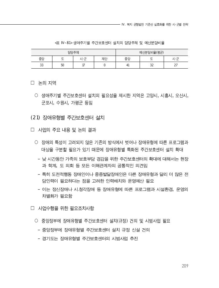 Ⅳ. 복지 균형발전 기준선 실효화를 위한 시·군별 전략 209 담당주체 예산분담비율(평균) 중앙 도 시·군 재단 중앙 도 시·군 33 50 17 0 41 32 27 <표 Ⅳ-81> 생애주기별 주간보호센터 설치의 담당주체 및 예산분담비율 □ 논의 지역 ○ 생애주기별 주간보호센터 설치의 필요성을 제시한 지역은 고양시, 시흥시, 오산시, 군포시, 수원시, 가평군 등임 (21) 장애유형별 주간보호센터 설치 □ 사업의 주요 내용 및 논의 결과 ○ 장애의 특성이 고려되지 않은 기존의 방식에서 벗어나 장애유형에 따른 프로그램과 대상을 구분할 필요가 있기 때문에 장애유형별 특화된 주간보호센터 설치 확대 - 낮 시간동안 가족의 보호부담 경감을 위한 주간보호센터의 확대에 대해서는 현장 과 학계, 도 의회 등 모든 이해관계자의 공통적인 의견임 - 특히 도전적행동 장애인이나 중증발달장애인은 다른 장애유형과 달리 더 많은 전 담인력이 필요하다는 점을 고려한 인력배치와 운영예산 필요 - 이는 정신장애나 시․청각장애 등 장애유형에 따른 프로그램과 시설환경, 운영의 차별화가 필요함 □ 사업수행을 위한 필요조치사항 ○ 중앙정부에 장애유형별 주간보호센터 설치(규정) 건의 및 시범사업 필요 - 중앙정부에 장애유형별 주간보호센터 설치 규정 신설 건의 - 경기도는 장애유형별 주간보호센터의 시범사업 추진