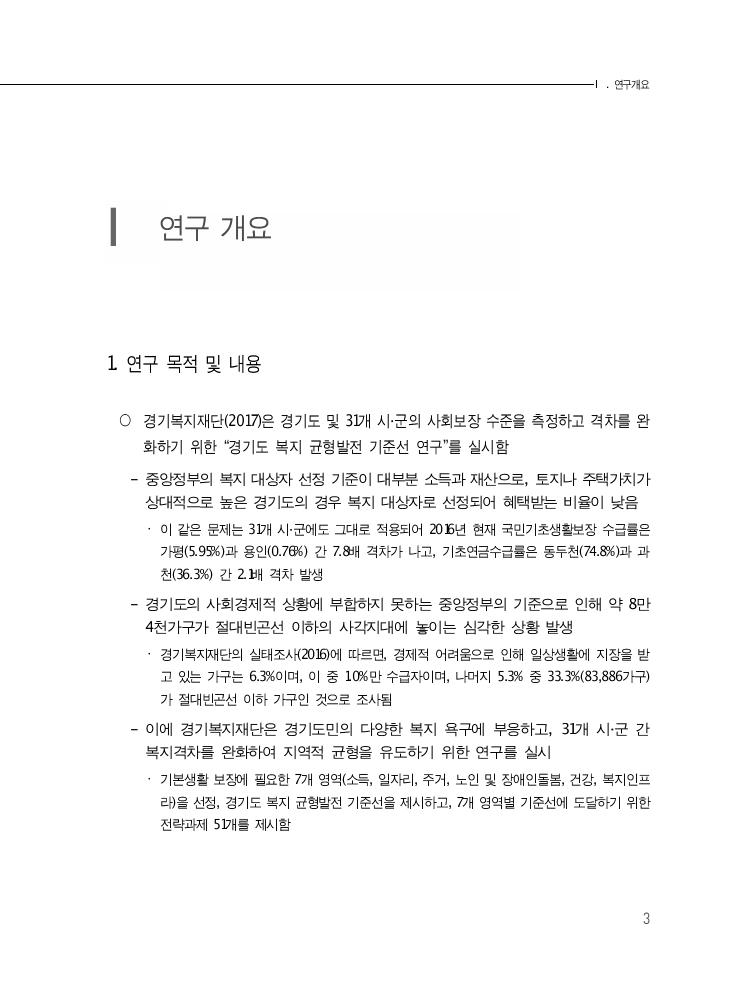 Ⅰ. 연구개요 3 Ⅰ연구 개요 1. 연구 목적 및 내용 ○ 경기복지재단(2017)은 경기도 및 31개 시·군의 사회보장 수준을 측정하고 격차를 완 화하기 위한 “경기도 복지 균형발전 기준선 연구”를 실시함 - 중앙정부의 복지 대상자 선정 기준이 대부분 소득과 재산으로, 토지나 주택가치가 상대적으로 높은 경기도의 경우 복지 대상자로 선정되어 혜택받는 비율이 낮음 ・ 이 같은 문제는 31개 시·군에도 그대로 적용되어 2016년 현재 국민기초생활보장 수급률은 가평(5.95%)과 용인(0.76%) 간 7.8배 격차가 나고, 기초연금수급률은 동두천(74.8%)과 과 천(36.3%) 간 2.1배 격차 발생 - 경기도의 사회경제적 상황에 부합하지 못하는 중앙정부의 기준으로 인해 약 8만 4천가구가 절대빈곤선 이하의 사각지대에 놓이는 심각한 상황 발생 ・ 경기복지재단의 실태조사(2016)에 따르면, 경제적 어려움으로 인해 일상생활에 지장을 받 고 있는 가구는 6.3%이며, 이 중 1.0%만 수급자이며, 나머지 5.3% 중 33.3%(83,886가구) 가 절대빈곤선 이하 가구인 것으로 조사됨 - 이에 경기복지재단은 경기도민의 다양한 복지 욕구에 부응하고, 31개 시·군 간 복지격차를 완화하여 지역적 균형을 유도하기 위한 연구를 실시 ・ 기본생활 보장에 필요한 7개 영역(소득, 일자리, 주거, 노인 및 장애인돌봄, 건강, 복지인프 라)을 선정, 경기도 복지 균형발전 기준선을 제시하고, 7개 영역별 기준선에 도달하기 위한 전략과제 51개를 제시함
