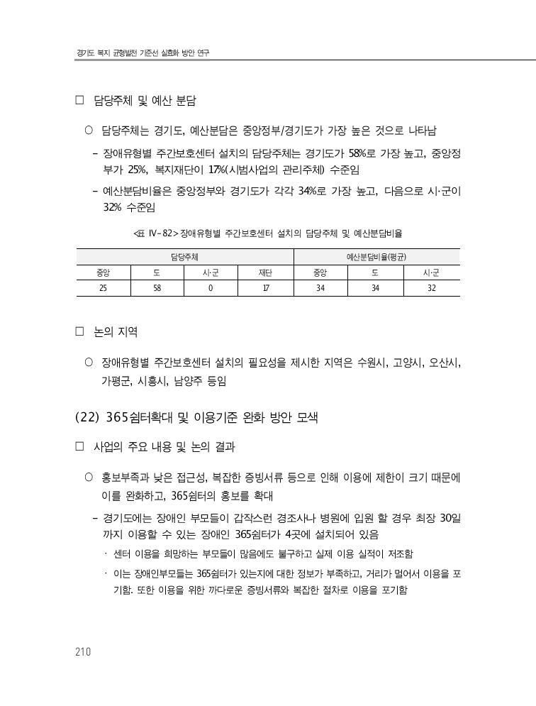 경기도 복지 균형발전 기준선 실효화 방안 연구 210 □ 담당주체 및 예산 분담 ○ 담당주체는 경기도, 예산분담은 중앙정부/경기도가 가장 높은 것으로 나타남 - 장애유형별 주간보호센터 설치의 담당주체는 경기도가 58%로 가장 높고, 중앙정 부가 25%, 복지재단이 17%(시범사업의 관리주체) 수준임 - 예산분담비율은 중앙정부와 경기도가 각각 34%로 가장 높고, 다음으로 시·군이 32% 수준임 담당주체 예산분담비율(평균) 중앙 도 시·군 재단 중앙 도 시·군 25 58 0 17 34 34 32 <표 Ⅳ-82> 장애유형별 주간보호센터 설치의 담당주체 및 예산분담비율 □ 논의 지역 ○ 장애유형별 주간보호센터 설치의 필요성을 제시한 지역은 수원시, 고양시, 오산시, 가평군, 시흥시, 남양주 등임 (22) 365쉼터확대 및 이용기준 완화 방안 모색 □ 사업의 주요 내용 및 논의 결과 ○ 홍보부족과 낮은 접근성, 복잡한 증빙서류 등으로 인해 이용에 제한이 크기 때문에 이를 완화하고, 365쉼터의 홍보를 확대 - 경기도에는 장애인 부모들이 갑작스런 경조사나 병원에 입원 할 경우 최장 30일 까지 이용할 수 있는 장애인 365쉼터가 4곳에 설치되어 있음 ・ 센터 이용을 희망하는 부모들이 많음에도 불구하고 실제 이용 실적이 저조함 ・ 이는 장애인부모들는 365쉼터가 있는지에 대한 정보가 부족하고, 거리가 멀어서 이용을 포 기함. 또한 이용을 위한 까다로운 증빙서류와 복잡한 절차로 이용을 포기함