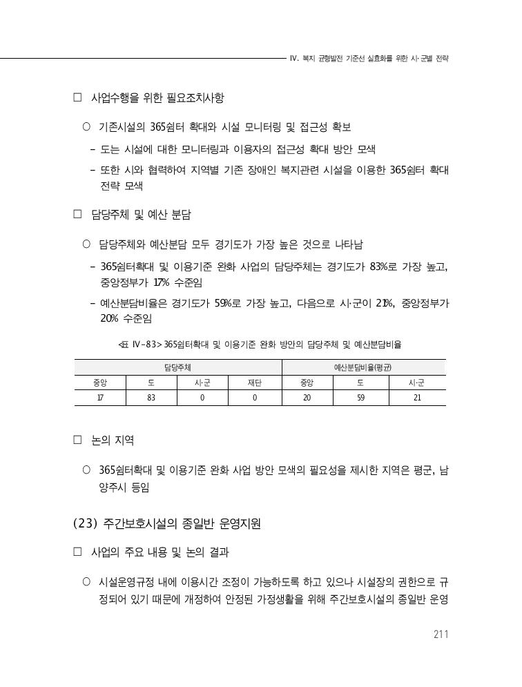 Ⅳ. 복지 균형발전 기준선 실효화를 위한 시·군별 전략 211 □ 사업수행을 위한 필요조치사항 ○ 기존시설의 365쉼터 확대와 시설 모니터링 및 접근성 확보 - 도는 시설에 대한 모니터링과 이용자의 접근성 확대 방안 모색 - 또한 시와 협력하여 지역별 기존 장애인 복지관련 시설을 이용한 365쉼터 확대 전략 모색 □ 담당주체 및 예산 분담 ○ 담당주체와 예산분담 모두 경기도가 가장 높은 것으로 나타남 - 365쉼터확대 및 이용기준 완화 사업의 담당주체는 경기도가 83%로 가장 높고, 중앙정부가 17% 수준임 - 예산분담비율은 경기도가 59%로 가장 높고, 다음으로 시·군이 21%, 중앙정부가 20% 수준임 담당주체 예산분담비율(평균) 중앙 도 시·군 재단 중앙 도 시·군 17 83 0 0 20 59 21 <표 Ⅳ-83> 365쉼터확대 및 이용기준 완화 방안의 담당주체 및 예산분담비율 □ 논의 지역 ○ 365쉼터확대 및 이용기준 완화 사업 방안 모색의 필요성을 제시한 지역은 평군, 남 양주시 등임 (23) 주간보호시설의 종일반 운영지원 □ 사업의 주요 내용 및 논의 결과 ○ 시설운영규정 내에 이용시간 조정이 가능하도록 하고 있으나 시설장의 권한으로 규 정되어 있기 때문에 개정하여 안정된 가정생활을 위해 주간보호시설의 종일반 운영