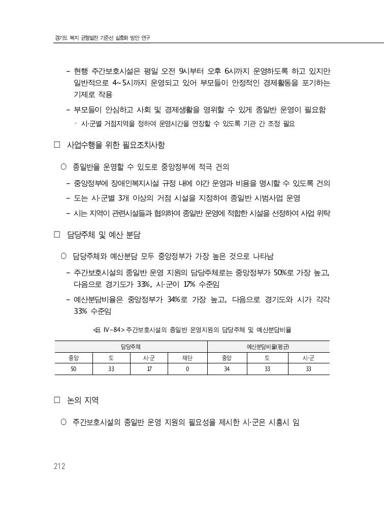 경기도 복지 균형발전 기준선 실효화 방안 연구 212 - 현행 주간보호시설은 평일 오전 9시부터 오후 6시까지 운영하도록 하고 있지만 일반적으로 4~5시까지 운영되고 있어 부모들이 안정적인 경제활동을 포기하는 기제로 작용 - 부모들이 안심하고 사회 및 경제생활을 영위할 수 있게 종일반 운영이 필요함 ・ 시·군별 거점지역을 정하여 운영시간을 연장할 수 있도록 기관 간 조정 필요 □ 사업수행을 위한 필요조치사항 ○ 종일반을 운영할 수 있도로 중앙정부에 적극 건의 - 중앙정부에 장애인복지시설 규정 내에 야간 운영과 비용을 명시할 수 있도록 건의 - 도는 시·군별 3개 이상의 거점 시설을 지정하여 종일반 시범사업 운영 - 시는 지역이 관련시설들과 협의하여 종일반 운영에 적합한 시설을 선정하여 사업 위탁 □ 담당주체 및 예산 분담 ○ 담당주체와 예산분담 모두 중앙정부가 가장 높은 것으로 나타남 - 주간보호시설의 종일반 운영 지원의 담당주체로는 중앙정부가 50%로 가장 높고, 다음으로 경기도가 33%, 시·군이 17% 수준임 - 예산분담비율은 중앙정부가 34%로 가장 높고, 다음으로 경기도와 시가 각각 33% 수준임 담당주체 예산분담비율(평균) 중앙 도 시·군 재단 중앙 도 시·군 50 33 17 0 34 33 33 <표 Ⅳ-84> 주간보호시설의 종일반 운영지원의 담당주체 및 예산분담비율 □ 논의 지역 ○ 주간보호시설의 종일반 운영 지원의 필요성을 제시한 시·군은 시흥시 임