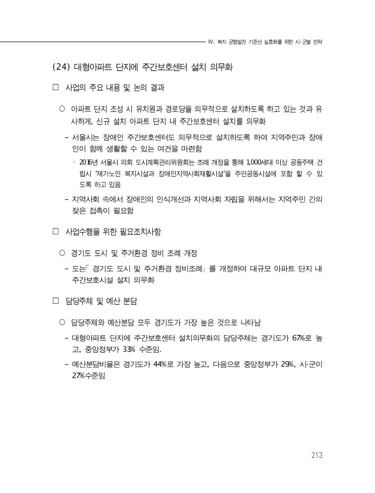 Ⅳ. 복지 균형발전 기준선 실효화를 위한 시·군별 전략 213 (24) 대형아파트 단지에 주간보호센터 설치 의무화 □ 사업의 주요 내용 및 논의 결과 ○ 아파트 단지 조성 시 유치원과 경로당을 의무적으로 설치하도록 하고 있는 것과 유 사하게, 신규 설치 아파트 단지 내 주간보호센터 설치를 의무화 - 서울시는 장애인 주간보호센터도 의무적으로 설치하도록 하여 지역주민과 장애 인이 함께 생활할 수 있는 여건을 마련함 ・ 2016년 서울시 의회 도시계획관리위원회는 조례 개정을 통해 1,000세대 이상 공동주택 건 립시 ‘재가노인 복지시설과 장애인지역사회재활시설’을 주민공동시설에 포함 할 수 있 도록 하고 있음 - 지역사회 속에서 장애인의 인식개선과 지역사회 자립을 위해서는 지역주민 간의 잦은 접촉이 필요함 □ 사업수행을 위한 필요조치사항 ○ 경기도 도시 및 주거환경 정비 조례 개정 - 도는「경기도 도시 및 주거환경 정비조례」를 개정하여 대규모 아파트 단지 내 주간보호시설 설치 의무화 □ 담당주체 및 예산 분담 ○ 담당주체와 예산분담 모두 경기도가 가장 높은 것으로 나타남 - 대형아파트 단지에 주간보호센터 설치의무화의 담당주체는 경기도가 67%로 높 고, 중앙정부가 33% 수준임. - 예산분담비율은 경기도가 44%로 가장 높고, 다음으로 중앙정부가 29%, 시·군이 27%수준임