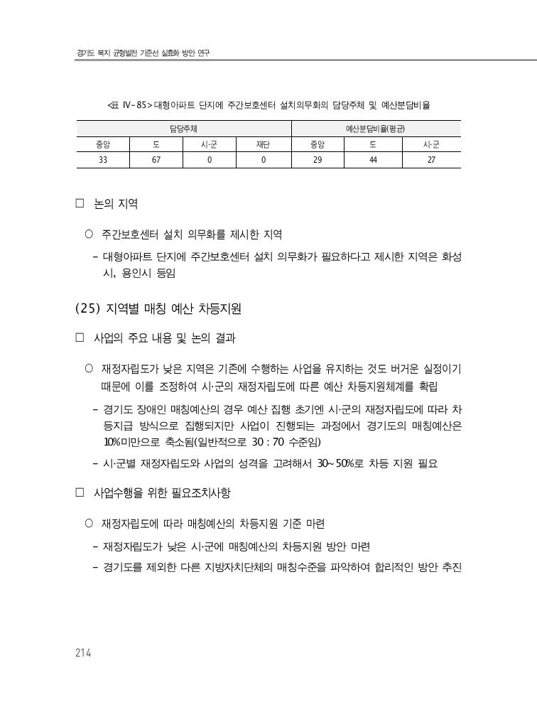 경기도 복지 균형발전 기준선 실효화 방안 연구 214 담당주체 예산분담비율(평균) 중앙 도 시·군 재단 중앙 도 시·군 33 67 0 0 29 44 27 <표 Ⅳ-85> 대형아파트 단지에 주간보호센터 설치의무화의 담당주체 및 예산분담비율 □ 논의 지역 ○ 주간보호센터 설치 의무화를 제시한 지역 - 대형아파트 단지에 주간보호센터 설치 의무화가 필요하다고 제시한 지역은 화성 시, 용인시 등임 (25) 지역별 매칭 예산 차등지원 □ 사업의 주요 내용 및 논의 결과 ○ 재정자립도가 낮은 지역은 기존에 수행하는 사업을 유지하는 것도 버거운 실정이기 때문에 이를 조정하여 시·군의 재정자립도에 따른 예산 차등지원체계를 확립 - 경기도 장애인 매칭예산의 경우 예산 집행 초기엔 시·군의 재정자립도에 따라 차 등지급 방식으로 집행되지만 사업이 진행되는 과정에서 경기도의 매칭예산은 10%미만으로 축소됨(일반적으로 30:70 수준임) - 시·군별 재정자립도와 사업의 성격을 고려해서 30~50%로 차등 지원 필요 □ 사업수행을 위한 필요조치사항 ○ 재정자립도에 따라 매칭예산의 차등지원 기준 마련 - 재정자립도가 낮은 시·군에 매칭예산의 차등지원 방안 마련 - 경기도를 제외한 다른 지방자치단체의 매칭수준을 파악하여 합리적인 방안 추진