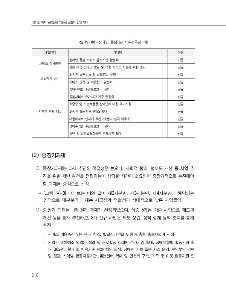경기도 복지 균형발전 기준선 실효화 방안 연구 218 사업영역 과제명 유형 서비스 이용증진 장애인 돌봄 서비스 홍보사업 활성화 기존 돌봄 대상 장애인 발굴 및 적합 서비스 지원을 위한 조사 신규 전달체계 정비 24시간 콜서비스 및 상담전화 운영 신규 서비스 신청 및 이용창구 일원화 신규 지역간 격차 해소 장애유형별 주간보호센터 설치 신규 돌봄서비스 추가시간 기준 일원화 신규 최중증 및 도전적행동 장애인에 대한 추가지원 신규 24시간 활동지원서비스 확대 신규 대형아파트 단지에 주간보호센터 설치 의무화 신규 생애주기별 주간보호센터 설치 신규 청년 및 성인발달장애인 추가시간 확대 신규 <표 Ⅳ-88> 장애인 돌봄 분야 우선추진과제 (2) 중․장기과제 ○ 중장기과제는 과제 추진의 적절성은 높으나, 사회적 합의, 법제도 개선 등 사업 추 진을 위한 제반 여건을 정립하는데 상당한 시간이 소요되어 중장기적으로 추진해야 할 과제를 중심으로 선정 - [그림 Ⅳ-3]에서 보는 바와 같이 제2사분면, 제3사분면, 제4사분면에 해당되는 영역으로 대부분의 과제는 시급성과 적절성이 상대적으로 낮은 사업들임 ○ 중․장기 과제는 총 14개 과제가 선정되었으며, 이중 6개는 기존 사업으로 제도의 개선 등을 통해 추진하고, 8개 신규 사업은 제도 정립, 정책 설계 등의 조치를 통해 추진 ・ 서비스 이용증진 영역은 시․청각, 발달장애인을 위한 맞춤형 홍보사업이 선정 ・ 지역간 격차해소 영역은 직업 및 근로활동 장애인 추가시간 확대, 장애유형별 활동지원 확 대, 365쉼터확대 및 이용기준 완화 방안 모색, 장애인 기초 돌봄 사업 운영, 본인부담 감면 및 경감, 지역별 활동지원기관, 돌봄센터 확대 및 인프라 구축, 가족 및 이웃 활동지원 인