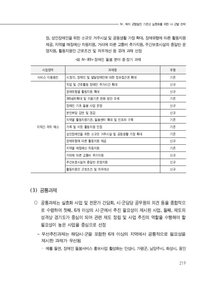 Ⅳ. 복지 균형발전 기준선 실효화를 위한 시·군별 전략 219 사업영역 과제명 유형 서비스 이용증진 시․청각, 장애인 및 발달장애인에 대한 정보접근권 확대 기존 지역간 격차 해소 직업 및 근로활동 장애인 추가시간 확대 신규 장애유형별 활동지원 확대 신규 365쉼터확대 및 이용기준 완화 방안 모색 기존 장애인 기초 돌봄 사업 운영 신규 본인부담 감면 및 경감 신규 지역별 활동지원기관, 돌봄센터 확대 및 인프라 구축 기존 가족 및 이웃 활동지원 인정 기존 성인장애인을 위한 소규모 거주시설 및 공동생활 가정 확대 기존 장애유형에 따른 활동지원 제공 신규 지역별 매칭예산 차등지원 기존 거리에 따른 교통비 추가지원 신규 주간보호시설의 종일반 운영지원 신규 활동지원인 근로조건 및 처우개선 신규 <표 Ⅳ-89> 장애인 돌봄 분야 중·장기 과제 정, 성인장애인을 위한 소규모 거주시설 및 공동생활 가정 확대, 장애유형에 따른 활동지원 제공, 지역별 매칭예산 차등지원, 거리에 따른 교통비 추가지원, 주간보호시설의 종일반 운 영지원, 활동지원인 근로조건 및 처우개선 등 13개 과제 선정 (3) 공통과제 ○ 공통과제는 실효화 사업 및 전문가 간담회, 시·군담당 공무원의 의견 등을 종합적으 로 수렴하여 첫째, 6개 이상의 시·군에서 추진 필요성이 제시된 사업, 둘째, 제도의 성격상 경기도가 중심이 되어 관련 제도 정립 및 사업 추진의 역할을 수행해야 할 필요성이 높은 사업을 중심으로 선정 - 우선추진과제는 해당시·군을 포함한 6개 이상의 지역에서 공통적으로 필요성을 제시한 과제가 우선됨 ・ 예를 들면, 장애인 돌봄서비스 홍보사업 활성화는 안성시, 가평군, 남양주시, 화성시, 용인