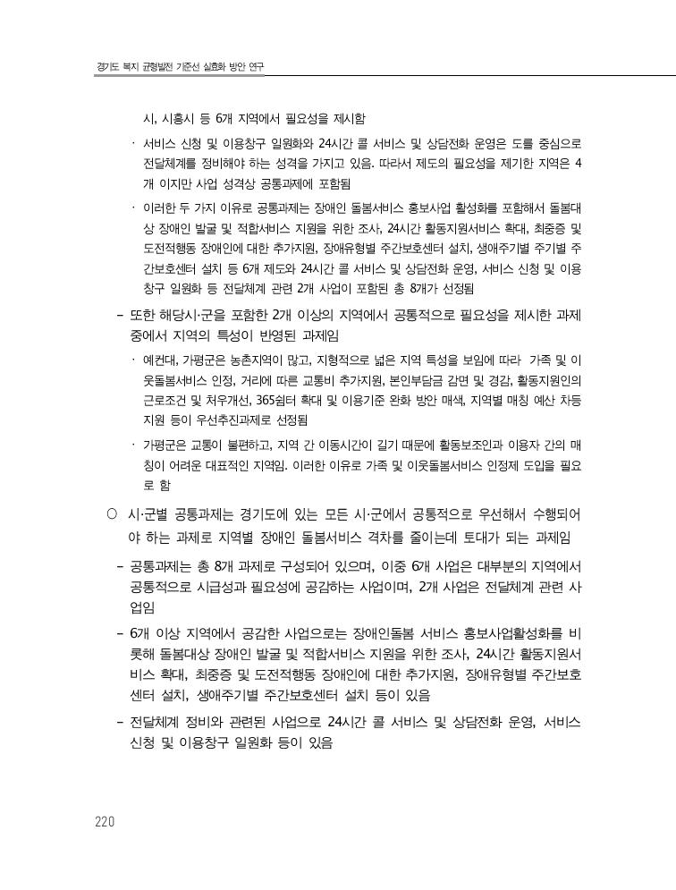 경기도 복지 균형발전 기준선 실효화 방안 연구 220 시, 시흥시 등 6개 지역에서 필요성을 제시함 ・ 서비스 신청 및 이용창구 일원화와 24시간 콜 서비스 및 상담전화 운영은 도를 중심으로 전달체계를 정비해야 하는 성격을 가지고 있음. 따라서 제도의 필요성을 제기한 지역은 4 개 이지만 사업 성격상 공통과제에 포함됨 ・ 이러한 두 가지 이유로 공통과제는 장애인 돌봄서비스 홍보사업 활성화를 포함해서 돌봄대 상 장애인 발굴 및 적합서비스 지원을 위한 조사, 24시간 활동지원서비스 확대, 최중증 및 도전적행동 장애인에 대한 추가지원, 장애유형별 주간보호센터 설치, 생애주기별 주기별 주 간보호센터 설치 등 6개 제도와 24시간 콜 서비스 및 상담전화 운영, 서비스 신청 및 이용 창구 일원화 등 전달체계 관련 2개 사업이 포함된 총 8개가 선정됨 - 또한 해당시·군을 포함한 2개 이상의 지역에서 공통적으로 필요성을 제시한 과제 중에서 지역의 특성이 반영된 과제임 ・ 예컨대, 가평군은 농촌지역이 많고, 지형적으로 넓은 지역 특성을 보임에 따라 가족 및 이 웃돌봄서비스 인정, 거리에 따른 교통비 추가지원, 본인부담금 감면 및 경감, 활동지원인의 근로조건 및 처우개선, 365쉼터 확대 및 이용기준 완화 방안 매색, 지역별 매칭 예산 차등 지원 등이 우선추진과제로 선정됨 ・ 가평군은 교통이 불편하고, 지역 간 이동시간이 길기 때문에 활동보조인과 이용자 간의 매 칭이 어려운 대표적인 지역임. 이러한 이유로 가족 및 이웃돌봄서비스 인정제 도입을 필요 로 함 ○ 시·군별 공통과제는 경기도에 있는 모든 시·군에서 공통적으로 우선해서 수행되어 야 하는 과제로 지역별 장애인 돌봄서비스 격차를 줄이는데 토대가 되는 과제임 - 공통과제는 총 8개 과제로 구성되어 있으며, 이중 6개 사업은 대부분의 지역에서 공통적으로 시급성과 필요성에 공감하는 사업이며, 2개 사업은 전달체계 관련 사 업임 - 6개 이상 지역에서 공감한 사업으로는 장애인돌봄 서비스 홍보사업활성화를 비 롯해 돌봄대상 장애인 발굴 및 적합서비스 지원을 위한 조사, 24시간 활동지원서 비스 확대, 최중증 및 도전적행동 장애인에 대한 추가지원, 장애유형별 주간보호 센터 설치, 생애주기별 주간보호센터 설치 등이 있음 - 전달체계 정비와 관련된 사업으로 24시간 콜 서비스 및 상담전화 운영, 서비스 신청 및 이용창구 일원화 등이 있음