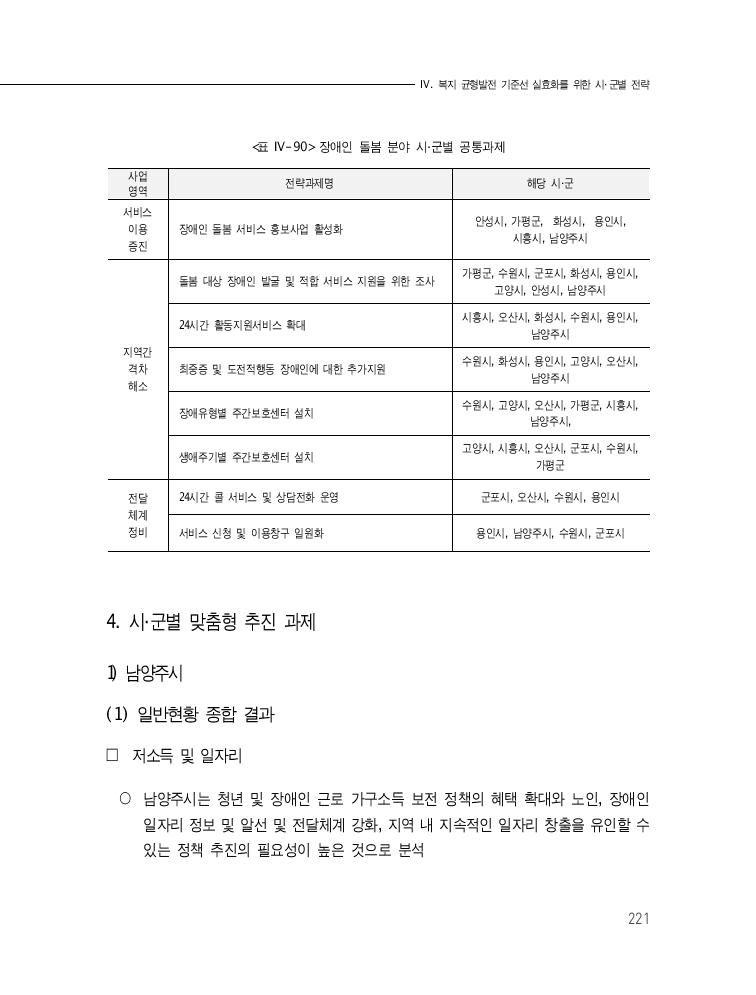 Ⅳ. 복지 균형발전 기준선 실효화를 위한 시·군별 전략 221 사업 영역 전략과제명 해당 시·군 서비스 이용 증진 장애인 돌봄 서비스 홍보사업 활성화 안성시, 가평군, 화성시, 용인시, 시흥시, 남양주시 지역간 격차 해소 돌봄 대상 장애인 발굴 및 적합 서비스 지원을 위한 조사 가평군, 수원시, 군포시, 화성시, 용인시, 고양시, 안성시, 남양주시 24시간 활동지원서비스 확대 시흥시, 오산시, 화성시, 수원시, 용인시, 남양주시 최중증 및 도전적행동 장애인에 대한 추가지원 수원시, 화성시, 용인시, 고양시, 오산시, 남양주시 장애유형별 주간보호센터 설치 수원시, 고양시, 오산시, 가평군, 시흥시, 남양주시, 생애주기별 주간보호센터 설치 고양시, 시흥시, 오산시, 군포시, 수원시, 가평군 전달 체계 정비 24시간 콜 서비스 및 상담전화 운영 군포시, 오산시, 수원시, 용인시 서비스 신청 및 이용창구 일원화 용인시, 남양주시, 수원시, 군포시 <표 Ⅳ-90> 장애인 돌봄 분야 시·군별 공통과제 4. 시·군별 맞춤형 추진 과제 1) 남양주시 (1) 일반현황 종합 결과 □ 저소득 및 일자리 ○ 남양주시는 청년 및 장애인 근로 가구소득 보전 정책의 혜택 확대와 노인, 장애인 일자리 정보 및 알선 및 전달체계 강화, 지역 내 지속적인 일자리 창출을 유인할 수 있는 정책 추진의 필요성이 높은 것으로 분석