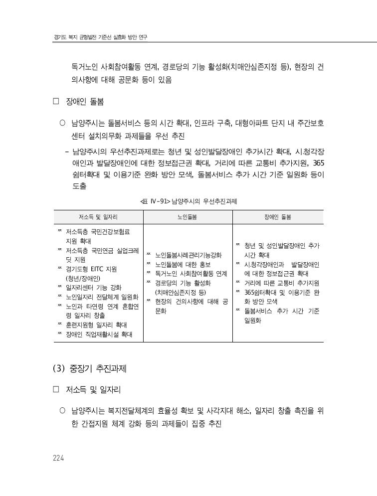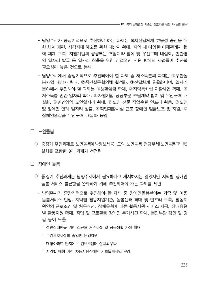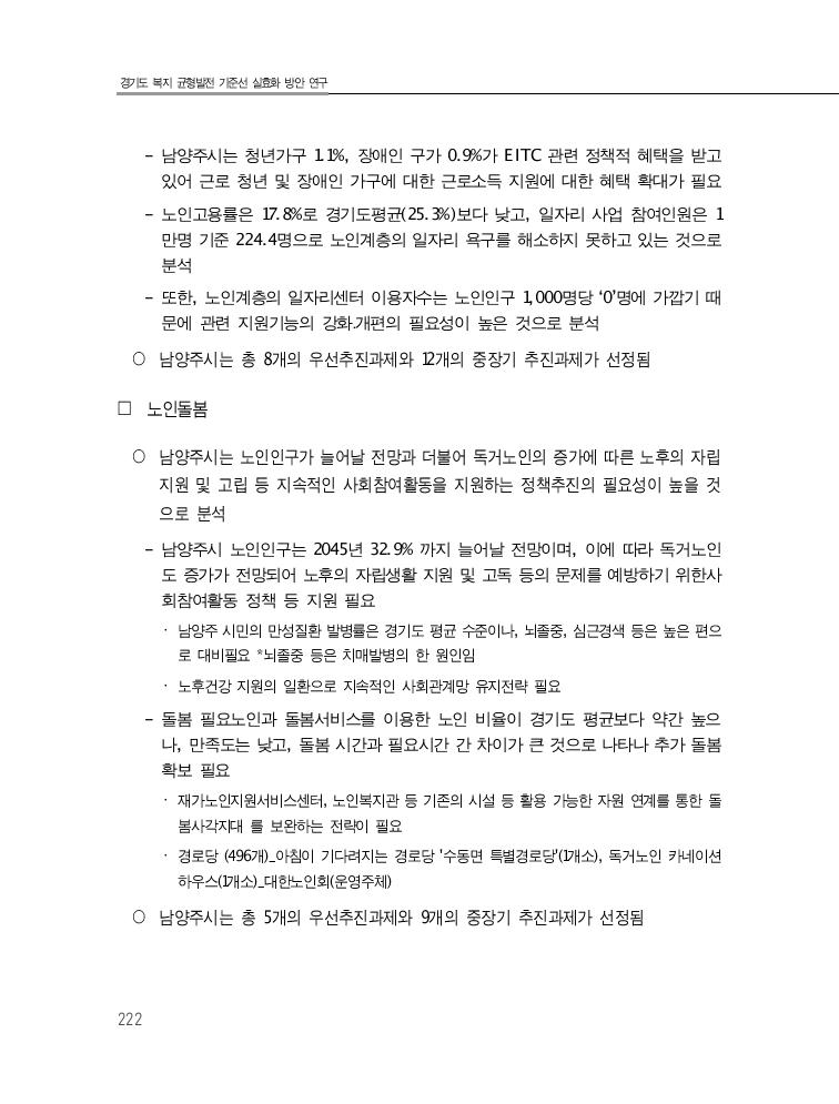 Ⅳ. 복지 균형발전 기준선 실효화를 위한 시·군별 전략 225 - 남양주시가 중장기적으로 추진해야 하는 과제는 복지전달체계 효율성 증진을 위 한 체계 개편, 사각지대 해소를 위한 대상자 확대, 지역 내 다양한 이해관계자 협 력 체계 구축, 자활기업의 공공부문 조달계약 참여 및 우선구매 내실화, 민간영 역 일자리 발굴 등 일자리 창출을 위한 간접적인 지원 방식의 사업들이 추진될 필요성이 높은 것으로 분석 - 남양주시에서 중장기적으로 추진되어야 할 과제 중 저소득분의 과제는 ①무한돌 봄사업 대상자 확대, ②중간실무협의체 활성화, ③전달체계 효율화이며, 일자리 분야에서 추진해야 할 과제는 ①생활임금 확대, ②지역특화형 자활사업 확대, ③ 저소득층 민간 일자리 확대, ④자활기업 공공부문 조달계약 참여 및 우선구매 내 실화, ⑤민간영역 노인일자리 확대, ⑥노인 전문 직업훈련 인프라 확충, ⑦노인 및 장애인 연계 일자리 창출, ⑧직업재활시설 근로 장애인 임금보조 및 지원, ⑨ 장애인생상품 우선구매 내실화 등임 □ 노인돌봄 ○ 중장기 추진과제로 노인돌봄예방정보제공, 도의 노인돌봄 전담부서(노인돌봄TF 등) 설치를 포함한 9개 과제가 선정됨 □ 장애인 돌봄 ○ 중․장기 추진과제는 남양주시에서 필요하다고 제시하지는 않았지만 지역별 장애인 돌봄 서비스 불균형을 완화하기 위해 추진되어야 하는 과제를 제안 - 남양주시가 중장기적으로 추진해야 할 과제 중 장애인돌봄분야는 가족 및 이웃 돌봄서비스 인정, 지역별 활동지원기관, 돌봄센터 확대 및 인프라 구축, 활동지 원인의 근로조건 및 처우개선, 장애유형에 따른 활동지원 서비스 제공, 장애유형 별 활동지원 확대, 직업 및 근로활동 장애인 추가시간 확대, 본인부담 감면 및 경 감 등이 도출 ・ 성인장애인을 위한 소규모 거주시설 및 공동생활 가정 확대 ・ 주간보호시설의 종일반 운영지원 ・ 대형아파트 단지에 주간보호센터 설치의무화 ・ 지역별 매칭 예산 차등지원장애인 기초돌봄사업 운영