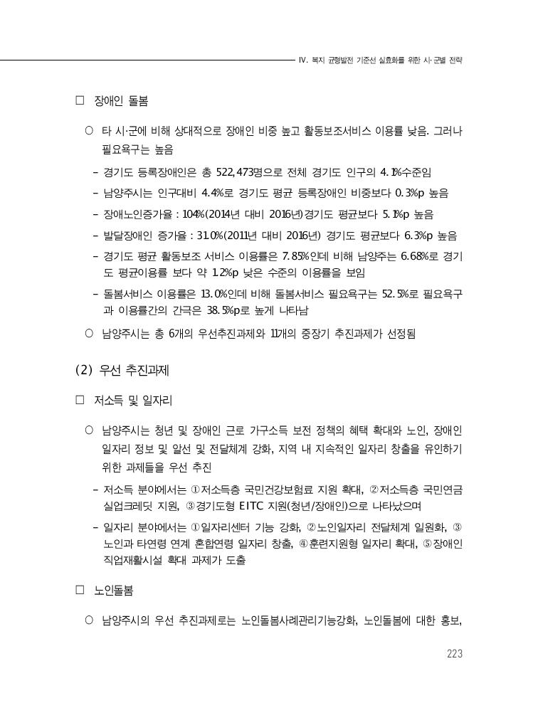 Ⅳ. 복지 균형발전 기준선 실효화를 위한 시·군별 전략 223 □ 장애인 돌봄 ○ 타 시·군에 비해 상대적으로 장애인 비중 높고 활동보조서비스 이용률 낮음. 그러나 필요욕구는 높음 - 경기도 등록장애인은 총 522,473명으로 전체 경기도 인구의 4.1%수준임 - 남양주시는 인구대비 4.4%로 경기도 평균 등록장애인 비중보다 0.3%p 높음 - 장애노인증가율:104%(2014년 대비 2016년)경기도 평균보다 5.1%p 높음 - 발달장애인 증가율:31.0%(2011년 대비 2016년) 경기도 평균보다 6.3%p 높음 - 경기도 평균 활동보조 서비스 이용률은 7.85%인데 비해 남양주는 6.68%로 경기 도 평균이용률 보다 약 1.2%p 낮은 수준의 이용률을 보임 - 돌봄서비스 이용률은 13.0%인데 비해 돌봄서비스 필요욕구는 52.5%로 필요욕구 과 이용률간의 간극은 38.5%p로 높게 나타남 ○ 남양주시는 총 6개의 우선추진과제와 11개의 중장기 추진과제가 선정됨 (2) 우선 추진과제 □ 저소득 및 일자리 ○ 남양주시는 청년 및 장애인 근로 가구소득 보전 정책의 혜택 확대와 노인, 장애인 일자리 정보 및 알선 및 전달체계 강화, 지역 내 지속적인 일자리 창출을 유인하기 위한 과제들을 우선 추진 - 저소득 분야에서는 ①저소득층 국민건강보험료 지원 확대, ②저소득층 국민연금 실업크레딧 지원, ③경기도형 EITC 지원(청년/장애인)으로 나타났으며 - 일자리 분야에서는 ①일자리센터 기능 강화, ②노인일자리 전달체계 일원화, ③ 노인과 타연령 연계 혼합연령 일자리 창출, ④훈련지원형 일자리 확대, ⑤장애인 직업재활시설 확대 과제가 도출 □ 노인돌봄 ○ 남양주시의 우선 추진과제로는 노인돌봄사례관리기능강화, 노인돌봄에 대한 홍보,
