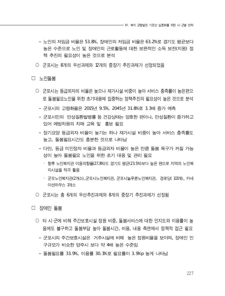Ⅳ. 복지 균형발전 기준선 실효화를 위한 시·군별 전략 227 - 노인의 저임금 비율은 53.8%, 장애인의 저임금 비율은 63.2%로 경기도 평균보다 높은 수준으로 노인 및 장애인의 근로활동에 대한 보완적인 소득 보전(지원) 정 책 추진의 필요성이 높은 것으로 분석 ○ 군포시는 8개의 우선과제와 12개의 중장기 추진과제가 선정되었음 □ 노인돌봄 ○ 군포시는 등급외자의 비율은 높으나 재가시설 비중이 높아 서비스 충족률이 높은편으 로 돌봄필요노인을 위한 초기대응에 집중하는 정책추진의 필요성이 높은 것으로 분석 - 군포시의 고령화율은 2015년 9.5%, 2045년 31.8%로 3.3배 증가 예측 - 군포시민의 만성질환발병률 등 건강상태는 양호한 편이나, 만성질환이 증가하고 있어 예방차원의 치매 교육 및 홍보 필요 - 장기요양 등급외자 비율이 높기는 하나 재가시설 비중이 높아 서비스 충족률도 높고, 돌봄필요시간도 충분한 것으로 나타남 - 다만, 등급 미인정자 비율과 등급외자 비율이 높은 만큼 돌봄 욕구가 커질 가능 성이 높아 돌봄필요 노인을 위한 초기 대응 및 관리 필요 ・ 향후 노인복지관 이용의향율(27.8%)도 경기도 평균(23.5%)보다 높은 편으로 지역의 노인복 지시설을 적극 활용 ・ 군포노인복지관(2개소)_군포시노인복지관, 군포시늘푸른노인복지관, 경로당( 113개)_ 카네 이션하우스 1개소 ○ 군포시는 총 6개의 우선추진과제와 8개의 중장기 추진과제가 선정됨 □ 장애인 돌봄 ○ 타 시·군에 비해 주간보호시설 정원 비중, 돌봄서비스에 대한 인지도와 이용률이 높 음에도 불구하고 돌봄부담 높아 돌봄시간, 비용, 내용 측면에서 정책적 접근 필요 - 군포시의 주간보호시설은 거주시설에 비해 높은 정원비율을 보이며, 장애인 인 구규모가 비슷한 양주시 보다 약 4배 높은 수준임 - 돌봄필요률 33.9%, 이용률 30.3%로 필요률이 3.9%p 높게 나타남