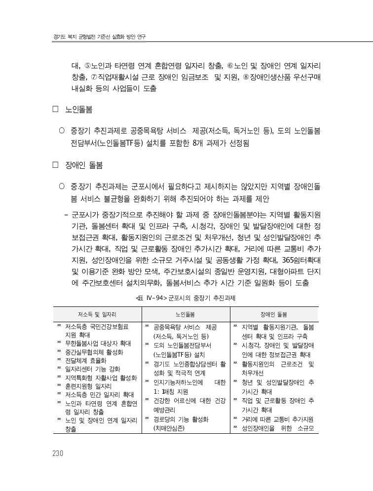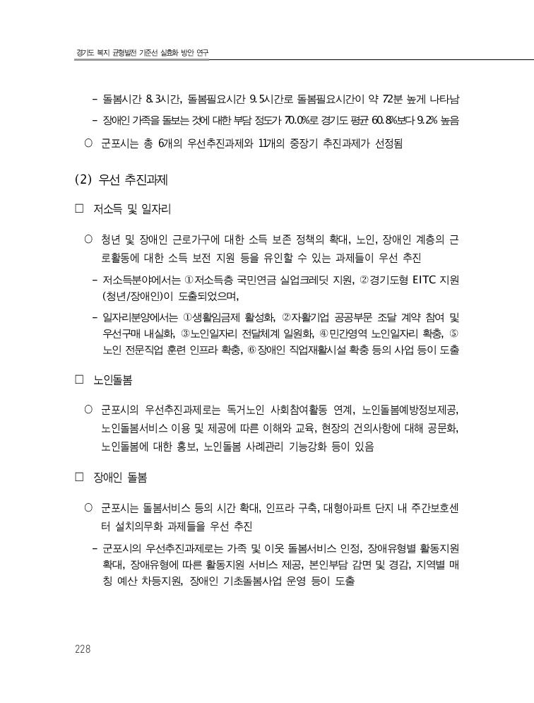 경기도 복지 균형발전 기준선 실효화 방안 연구 228 - 돌봄시간 8.3시간, 돌봄필요시간 9.5시간로 돌봄필요시간이 약 72분 높게 나타남 - 장애인 가족을 돌보는 것에 대한 부담 정도가 70.0%로 경기도 평균 60.8%보다 9.2% 높음 ○ 군포시는 총 6개의 우선추진과제와 11개의 중장기 추진과제가 선정됨 (2) 우선 추진과제 □ 저소득 및 일자리 ○ 청년 및 장애인 근로가구에 대한 소득 보존 정책의 확대, 노인, 장애인 계층의 근 로활동에 대한 소득 보전 지원 등을 유인할 수 있는 과제들이 우선 추진 - 저소득분야에서는 ①저소득층 국민연금 실업크레딧 지원, ②경기도형 EITC 지원 (청년/장애인)이 도출되었으며, - 일자리분양에서는 ①생활임금제 활성화, ②자활기업 공공부문 조달 계약 참여 및 우선구매 내실화, ③노인일자리 전달체계 일원화, ④민간영역 노인일자리 확충, ⑤ 노인 전문직업 훈련 인프라 확충, ⑥장애인 직업재활시설 확충 등의 사업 등이 도출 □ 노인돌봄 ○ 군포시의 우선추진과제로는 독거노인 사회참여활동 연계, 노인돌봄예방정보제공, 노인돌봄서비스 이용 및 제공에 따른 이해와 교육, 현장의 건의사항에 대해 공문화, 노인돌봄에 대한 홍보, 노인돌봄 사례관리 기능강화 등이 있음 □ 장애인 돌봄 ○ 군포시는 돌봄서비스 등의 시간 확대, 인프라 구축, 대형아파트 단지 내 주간보호센 터 설치의무화 과제들을 우선 추진 - 군포시의 우선추진과제로는 가족 및 이웃 돌봄서비스 인정, 장애유형별 활동지원 확대, 장애유형에 따른 활동지원 서비스 제공, 본인부담 감면 및 경감, 지역별 매 칭 예산 차등지원, 장애인 기초돌봄사업 운영 등이 도출