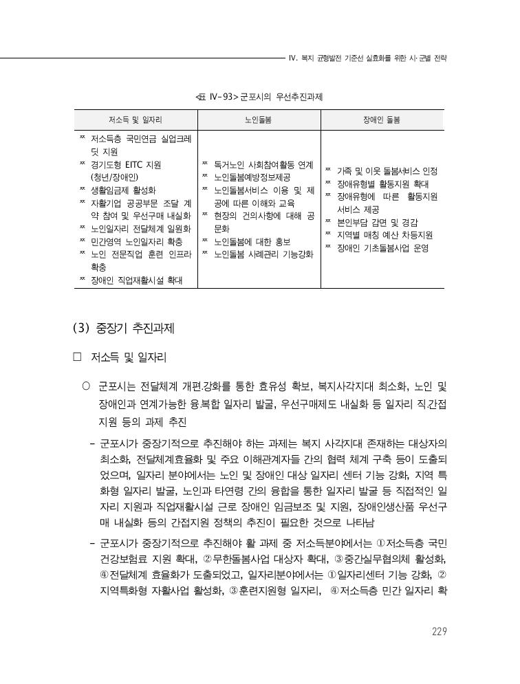 Ⅳ. 복지 균형발전 기준선 실효화를 위한 시·군별 전략 229 저소득 및 일자리 노인돌봄 장애인 돌봄  저소득층 국민연금 실업크레 딧 지원  경기도형 EITC 지원 (청년/장애인)  생활임금제 활성화  자활기업 공공부문 조달 계 약 참여 및 우선구매 내실화  노인일자리 전달체계 일원화  민간영역 노인일자리 확충  노인 전문직업 훈련 인프라 확충  장애인 직업재활시설 확대  독거노인 사회참여활동 연계  노인돌봄예방정보제공  노인돌봄서비스 이용 및 제 공에 따른 이해와 교육  현장의 건의사항에 대해 공 문화  노인돌봄에 대한 홍보  노인돌봄 사례관리 기능강화  가족 및 이웃 돌봄서비스 인정  장애유형별 활동지원 확대  장애유형에 따른 활동지원 서비스 제공  본인부담 감면 및 경감  지역별 매칭 예산 차등지원  장애인 기초돌봄사업 운영 <표 Ⅳ-93> 군포시의 우선추진과제 (3) 중장기 추진과제 □ 저소득 및 일자리 ○ 군포시는 전달체계 개편․강화를 통한 효유성 확보, 복지사각지대 최소화, 노인 및 장애인과 연계가능한 융․복합 일자리 발굴, 우선구매제도 내실화 등 일자리 직․간접 지원 등의 과제 추진 - 군포시가 중장기적으로 추진해야 하는 과제는 복지 사각지대 존재하는 대상자의 최소화, 전달체계효율화 및 주요 이해관계자들 간의 협력 체계 구축 등이 도출되 었으며, 일자리 분야에서는 노인 및 장애인 대상 일자리 센터 기능 강화, 지역 특 화형 일자리 발굴, 노인과 타연령 간의 융합을 통한 일자리 발굴 등 직접적인 일 자리 지원과 직업재활시설 근로 장애인 임금보조 및 지원, 장애인생산품 우선구 매 내실화 등의 간접지원 정책의 추진이 필요한 것으로 나타남 - 군포시가 중장기적으로 추진해야 활 과제 중 저소득분야에서는 ①저소득층 국민 건강보험료 지원 확대, ②무한돌봄사업 대상자 확대, ③중간실무협의체 활성화, ④전달체계 효율화가 도출되었고, 일자리분야에서는 ①일자리센터 기능 강화, ② 지역특화형 자활사업 활성화, ③훈련지원형 일자리, ④저소득층 민간 일자리 확