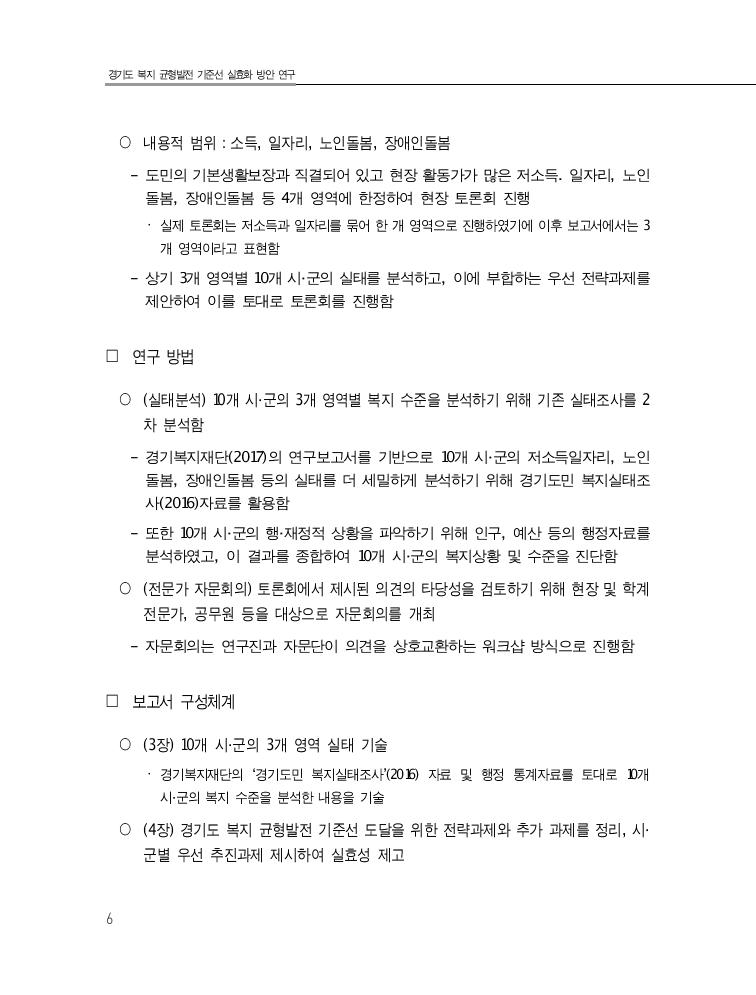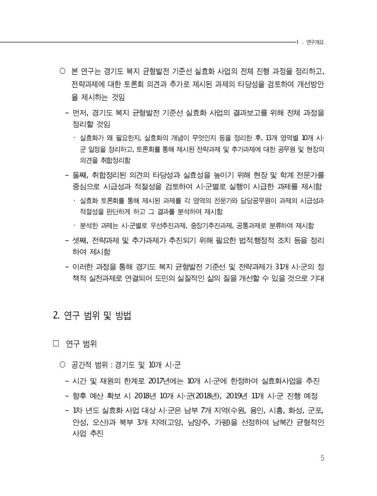 Ⅰ. 연구개요 5 ○ 본 연구는 경기도 복지 균형발전 기준선 실효화 사업의 전체 진행 과정을 정리하고, 전략과제에 대한 토론회 의견과 추가로 제시된 과제의 타당성을 검토하여 개선방안 을 제시하는 것임 - 먼저, 경기도 복지 균형발전 기준선 실효화 사업의 결과보고를 위해 전체 과정을 정리할 것임 ・ 실효화가 왜 필요한지, 실효화의 개념이 무엇인지 등을 정리한 후, 13개 영역별 10개 시· 군 일정을 정리하고, 토론회를 통해 제시된 전략과제 및 추가과제에 대한 공무원 및 현장의 의견을 취합정리함 - 둘째, 취합정리된 의견의 타당성과 실효성을 높이기 위해 현장 및 학계 전문가를 중심으로 시급성과 적절성을 검토하여 시·군별로 실행이 시급한 과제를 제시함 ・ 실효화 토론회를 통해 제시된 과제를 각 영역의 전문가와 담당공무원이 과제의 시급성과 적절성을 판단하게 하고 그 결과를 분석하여 제시함 ・ 분석한 과제는 시·군별로 우선추진과제, 중장기추진과제, 공통과제로 분류하여 제시함 - 셋째, 전략과제 및 추가과제가 추진되기 위해 필요한 법적․행정적 조치 등을 정리 하여 제시함 - 이러한 과정을 통해 경기도 복지 균형발전 기준선 및 전략과제가 31개 시·군의 정 책적 실천과제로 연결되어 도민의 실질적인 삶의 질을 개선할 수 있을 것으로 기대 2. 연구 범위 및 방법 □ 연구 범위 ○ 공간적 범위:경기도 및 10개 시·군 - 시간 및 재원의 한계로 2017년에는 10개 시·군에 한정하여 실효화사업을 추진 - 향후 예산 확보 시 2018년 10개 시·군(2018년), 2019년 11개 시·군 진행 예정 - 1차 년도 실효화 사업 대상 시·군은 남부 7개 지역(수원, 용인, 시흥, 화성, 군포, 안성, 오산)과 북부 3개 지역(고양, 남양주, 가평)을 선정하여 남북간 균형적인 사업 추진