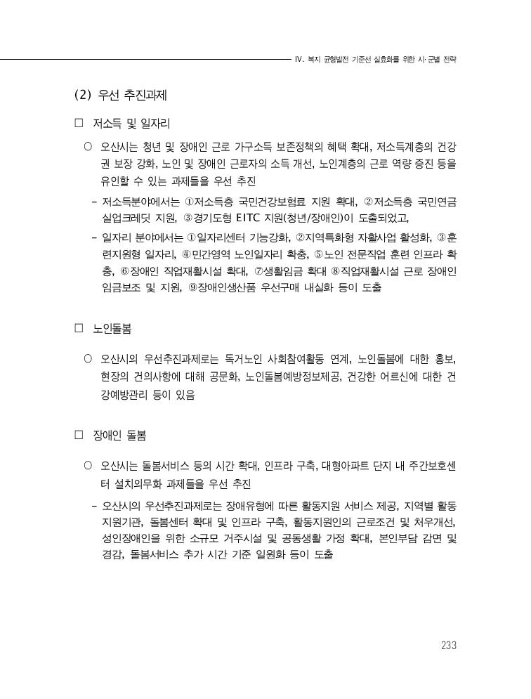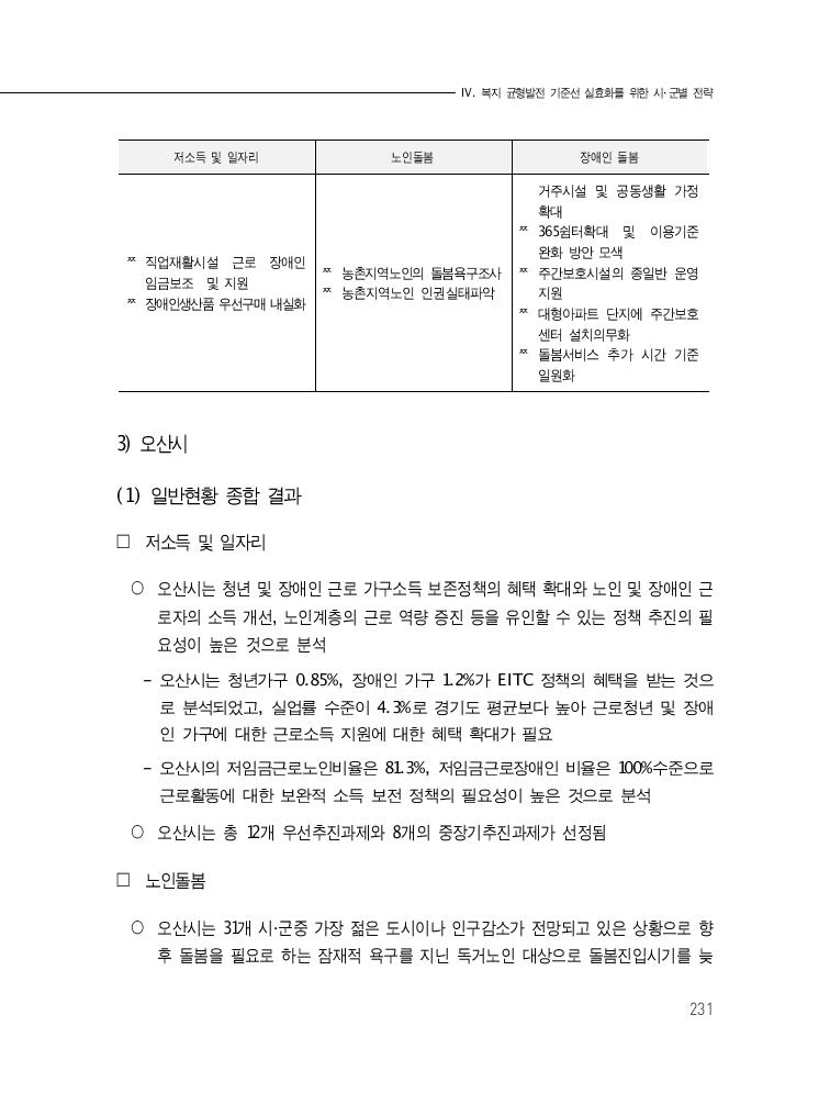Ⅳ. 복지 균형발전 기준선 실효화를 위한 시·군별 전략 233 (2) 우선 추진과제 □ 저소득 및 일자리 ○ 오산시는 청년 및 장애인 근로 가구소득 보존정책의 혜택 확대, 저소득계층의 건강 권 보장 강화, 노인 및 장애인 근로자의 소득 개선, 노인계층의 근로 역량 증진 등을 유인할 수 있는 과제들을 우선 추진 - 저소득분야에서는 ①저소득층 국민건강보험료 지원 확대, ②저소득층 국민연금 실업크레딧 지원, ③경기도형 EITC 지원(청년/장애인)이 도출되었고, - 일자리 분야에서는 ①일자리센터 기능강화, ②지역특화형 자활사업 활성화, ③훈 련지원형 일자리, ④민간영역 노인일자리 확충, ⑤노인 전문직업 훈련 인프라 확 충, ⑥장애인 직업재활시설 확대, ⑦생활임금 확대 ⑧직업재활시설 근로 장애인 임금보조 및 지원, ⑨장애인생산품 우선구매 내실화 등이 도출 □ 노인돌봄 ○ 오산시의 우선추진과제로는 독거노인 사회참여활동 연계, 노인돌봄에 대한 홍보, 현장의 건의사항에 대해 공문화, 노인돌봄예방정보제공, 건강한 어르신에 대한 건 강예방관리 등이 있음 □ 장애인 돌봄 ○ 오산시는 돌봄서비스 등의 시간 확대, 인프라 구축, 대형아파트 단지 내 주간보호센 터 설치의무화 과제들을 우선 추진 - 오산시의 우선추진과제로는 장애유형에 따른 활동지원 서비스 제공, 지역별 활동 지원기관, 돌봄센터 확대 및 인프라 구축, 활동지원인의 근로조건 및 처우개선, 성인장애인을 위한 소규모 거주시설 및 공동생활 가정 확대, 본인부담 감면 및 경감, 돌봄서비스 추가 시간 기준 일원화 등이 도출