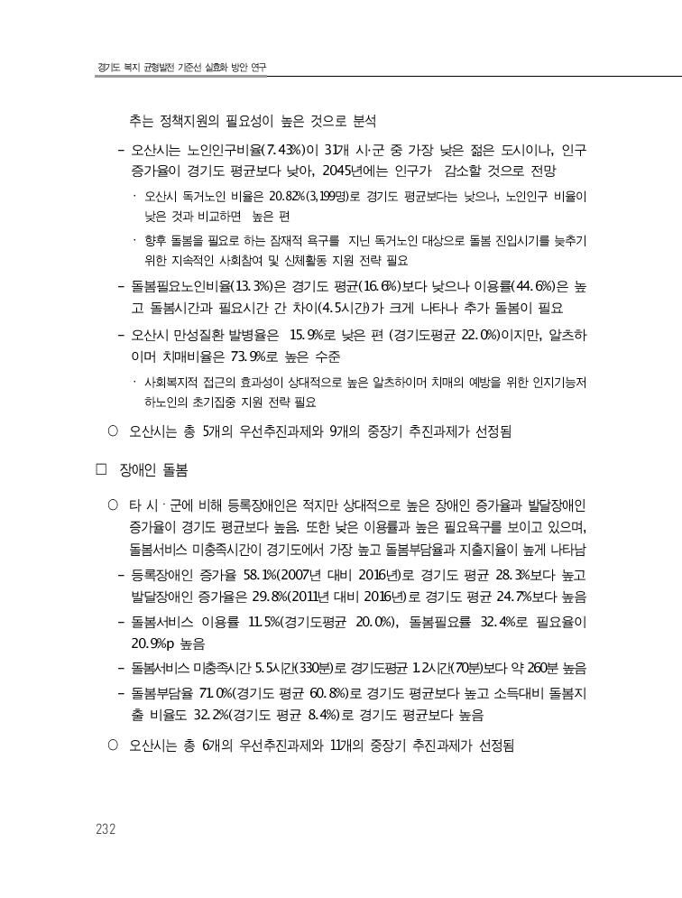 경기도 복지 균형발전 기준선 실효화 방안 연구 232 추는 정책지원의 필요성이 높은 것으로 분석 - 오산시는 노인인구비율(7.43%)이 31개 시·군 중 가장 낮은 젊은 도시이나, 인구 증가율이 경기도 평균보다 낮아, 2045년에는 인구가 감소할 것으로 전망 ・ 오산시 독거노인 비율은 20.82%(3,199명)로 경기도 평균보다는 낮으나, 노인인구 비율이 낮은 것과 비교하면 높은 편 ・ 향후 돌봄을 필요로 하는 잠재적 욕구를 지닌 독거노인 대상으로 돌봄 진입시기를 늦추기 위한 지속적인 사회참여 및 신체활동 지원 전략 필요 - 돌봄필요노인비율(13.3%)은 경기도 평균(16.6%)보다 낮으나 이용률(44.6%)은 높 고 돌봄시간과 필요시간 간 차이(4.5시간)가 크게 나타나 추가 돌봄이 필요 - 오산시 만성질환 발병율은 15.9%로 낮은 편 (경기도평균 22.0%)이지만, 알츠하 이머 치매비율은 73.9%로 높은 수준 ・ 사회복지적 접근의 효과성이 상대적으로 높은 알츠하이머 치매의 예방을 위한 인지기능저 하노인의 초기집중 지원 전략 필요 ○ 오산시는 총 5개의 우선추진과제와 9개의 중장기 추진과제가 선정됨 □ 장애인 돌봄 ○ 타 시ㆍ군에 비해 등록장애인은 적지만 상대적으로 높은 장애인 증가율과 발달장애인 증가율이 경기도 평균보다 높음. 또한 낮은 이용률과 높은 필요욕구를 보이고 있으며, 돌봄서비스 미충족시간이 경기도에서 가장 높고 돌봄부담율과 지출지율이 높게 나타남 - 등록장애인 증가율 58.1%(2007년 대비 2016년)로 경기도 평균 28.3%보다 높고 발달장애인 증가율은 29.8%(2011년 대비 2016년)로 경기도 평균 24.7%보다 높음 - 돌봄서비스 이용률 11.5%(경기도평균 20.0%), 돌봄필요률 32.4%로 필요율이 20.9%p 높음 - 돌봄서비스 미충족시간 5.5시간(330분)로 경기도평균 1.2시간(70분)보다 약 260분 높음 - 돌봄부담율 71.0%(경기도 평균 60.8%)로 경기도 평균보다 높고 소득대비 돌봄지 출 비율도 32.2%(경기도 평균 8.4%)로 경기도 평균보다 높음 ○ 오산시는 총 6개의 우선추진과제와 11개의 중장기 추진과제가 선정됨