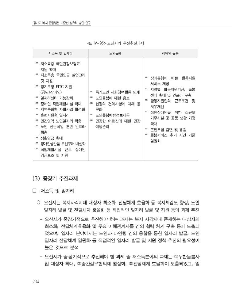 경기도 복지 균형발전 기준선 실효화 방안 연구 234 저소득 및 일자리 노인돌봄 장애인 돌봄  저소득층 국민건강보험료 지원 확대  저소득층 국민연금 실업크레 딧 지원  경기도형 EITC 지원 (청년/장애인)  일자리센터 기능강화  장애인 직업재활시설 확대  지역특화형 자활사업 활성화  훈련지원형 일자리  민간영역 노인일자리 확충  노인 전문직업 훈련 인프라 확충  생활임금 확대  장애인생산품 우선구매 내실화  직업재활시설 근로 장애인 임금보조 및 지원  독거노인 사회참여활동 연계  노인돌봄에 대한 홍보  현장의 건의사항에 대해 공 문화  노인돌봄예방정보제공  건강한 어르신에 대한 건강 예방관리  장애유형에 따른 활동지원 서비스 제공  지역별 활동지원기관, 돌봄 센터 확대 및 인프라 구축  활동지원인의 근로조건 및 처우개선  성인장애인을 위한 소규모 거주시설 및 공동 생활 가정 확대  본인부담 감면 및 경감  돌봄서비스 추가 시간 기준 일원화 <표 Ⅳ-95> 오산시의 우선추진과제 (3) 중장기 추진과제 □ 저소득 및 일자리 ○ 오산시는 복지사각지대 대상자 최소화, 전달체계 효율화 등 복지체감도 향상, 노인 일자리 발굴 및 전달체계 효율화 등 직접적인 일자리 발굴 및 지원 등의 과제 추진 - 오산시가 중장기적으로 추진해야 하는 과제는 복지 사각지대 존재하는 대상자의 최소화, 전달체계효율화 및 주요 이해관계자들 간의 협력 체계 구축 등이 도출되 었으며, 일자리 분야에서는 노인과 타연령 간의 융합을 통한 일자리 발굴, 노인 일자리 전달체계 일원화 등 직접적인 일자리 발굴 및 지원 정책 추진의 필요성이 높은 것으로 분석 - 오산시가 중․장기적으로 추진해야 할 과제 중 저소득분야의 과제는 ①무한돌봄사 업 대상자 확대, ②중간실무협의체 활성화, ③전달체계 효율화이 도출되었고, 일