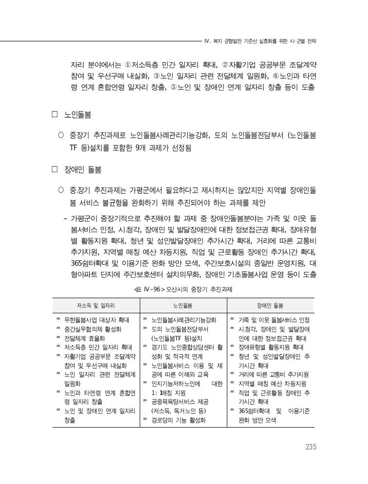 Ⅳ. 복지 균형발전 기준선 실효화를 위한 시·군별 전략 235 저소득 및 일자리 노인돌봄 장애인 돌봄  무한돌봄사업 대상자 확대  중간실무협의체 활성화  전달체계 효율화  저소득층 민간 일자리 확대  자활기업 공공부문 조달계약 참여 및 우선구매 내실화  노인 일자리 관련 전달체계 일원화  노인과 타연령 연계 혼합연 령 일자리 창출  노인 및 장애인 연계 일자리 창출  노인돌봄사례관리기능강화  도의 노인돌봄전담부서 (노인돌봄TF 등)설치  경기도 노인종합상담센터 활 성화 및 적극적 연계  노인돌봄서비스 이용 및 제 공에 따른 이해와 교육  인지기능저하노인에 대한 1:1매칭 지원  공중목욕탕서비스 제공 (저소득, 독거노인 등)  경로당의 기능 활성화  가족 및 이웃 돌봄서비스 인정  시․청각, 장애인 및 발달장애 인에 대한 정보접근권 확대  장애유형별 활동지원 확대  청년 및 성인발달장애인 추 가시간 확대  거리에 따른 교통비 추가지원  지역별 매칭 예산 차등지원  직업 및 근로활동 장애인 추 가시간 확대  365쉼터확대 및 이용기준 완화 방안 모색 <표 Ⅳ-96> 오산시의 중장기 추진과제 자리 분야에서는 ①저소득층 민간 일자리 확대, ②자활기업 공공부문 조달계약 참여 및 우선구매 내실화, ③노인 일자리 관련 전달체계 일원화, ④노인과 타연 령 연계 혼합연령 일자리 창출, ⑤노인 및 장애인 연계 일자리 창출 등이 도출 □ 노인돌봄 ○ 중장기 추진과제로 노인돌봄사례관리기능강화, 도의 노인돌봄전담부서 (노인돌봄 TF 등)설치를 포함한 9개 과제가 선정됨 □ 장애인 돌봄 ○ 중․장기 추진과제는 가평군에서 필요하다고 제시하지는 않았지만 지역별 장애인돌 봄 서비스 불균형을 완화하기 위해 추진되어야 하는 과제를 제안 - 가평군이 중장기적으로 추진해야 할 과제 중 장애인돌봄분야는 가족 및 이웃 돌 봄서비스 인정, 시․청각, 장애인 및 발달장애인에 대한 정보접근권 확대, 장애유형 별 활동지원 확대, 청년 및 성인발달장애인 추가시간 확대, 거리에 따른 교통비 추가지원, 지역별 매칭 예산 차등지원, 직업 및 근로활동 장애인 추가시간 확대, 365쉼터확대 및 이용기준 완화 방안 모색, 주간보호시설의 종일반 운영지원, 대 형아파트 단지에 주간보호센터 설치의무화, 장애인 기초돌봄사업 운영 등이 도출