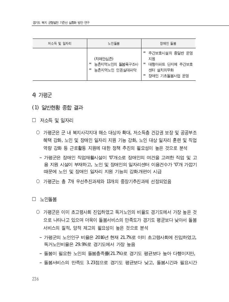 경기도 복지 균형발전 기준선 실효화 방안 연구 236 저소득 및 일자리 노인돌봄 장애인 돌봄 (치매안심존)  농촌지역노인의 돌봄욕구조사  농촌지역노인 인권실태파악  주간보호시설의 종일반 운영 지원  대형아파트 단지에 주간보호 센터 설치의무화  장애인 기초돌봄사업 운영 4) 가평군 (1) 일반현황 종합 결과 □ 저소득 및 일자리 ○ 가평군은 군 내 복지사각지대 해소 대상자 확대, 저소득층 건강권 보장 및 공공부조 혜택 강화, 노인 및 장애인 일자리 지원 기능 강화, 노인 대상 일자리 훈련 및 직업 역량 강화 등 근로활동 지원에 대한 정책 추진의 필요성이 높은 것으로 분석 - 가평군은 장애인 직업재활시설이 ‘0’개소로 장애인의 여건을 고려한 직업 및 고 용 지원 시설이 부재하고, 노인 및 장애인의 일자리센터 이용건수가 ‘0’개 가깝기 때문에 노인 및 장애인 일자리 지원 기능의 강화․개편이 시급 ○ 가평군는 총 7개 우선추진과제와 13개의 중장기추진과제 선정되었음 □ 노인돌봄 ○ 가평군은 이미 초고령사회 진입하였고 독거노인의 비율도 경기도에서 가장 높은 것 으로 나타나고 있으며 더욱이 돌봄서비스의 만족도가 경기도 평균보다 낮아서 돌봄 서비스의 질적, 양적 제고의 필요성이 높은 것으로 분석 - 가평군의 노인인구 비율은 2016년 현재 21.7%로 이미 초고령사회에 진입하였고, 독거노인비율은 29.9%로 경기도에서 가장 높음 - 돌봄이 필요한 노인의 돌봄충족률(21.7%)로 경기도 평균보다 높아 다행이지만, - 돌봄서비스의 만족도 3.23점으로 경기도 평균보다 낮고, 돌봄시간과 필요시간
