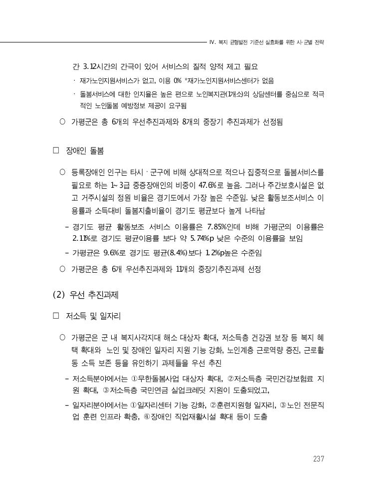 Ⅳ. 복지 균형발전 기준선 실효화를 위한 시·군별 전략 237 간 3.12시간의 간극이 있어 서비스의 질적 양적 제고 필요 ・ 재가노인지원서비스가 없고, 이용 0% *재가노인지원서비스센터가 없음 ・ 돌봄서비스에 대한 인지율은 높은 편으로 노인복지관(1개소)의 상담센터를 중심으로 적극 적인 노인돌봄 예방정보 제공이 요구됨 ○ 가평군은 총 6개의 우선추진과제와 8개의 중장기 추진과제가 선정됨 □ 장애인 돌봄 ○ 등록장애인 인구는 타시ㆍ군구에 비해 상대적으로 적으나 집중적으로 돌봄서비스를 필요로 하는 1~3급 중증장애인의 비중이 47.6%로 높음. 그러나 주간보호시설은 없 고 거주시설의 정원 비율은 경기도에서 가장 높은 수준임. 낮은 활동보조서비스 이 용률과 소득대비 돌봄지출비율이 경기도 평균보다 높게 나타남 - 경기도 평균 활동보조 서비스 이용률은 7.85%인데 비해 가평군의 이용률은 2.11%로 경기도 평균이용률 보다 약 5.74%p 낮은 수준의 이용률을 보임 - 가평균은 9.6%로 경기도 평균(8.4%)보다 1.2%p높은 수준임 ○ 가평군은 총 6개 우선추진과제와 11개의 중장기추진과제 선정 (2) 우선 추진과제 □ 저소득 및 일자리 ○ 가평군은 군 내 복지사각지대 해소 대상자 확대, 저소득층 건강권 보장 등 복지 혜 택 확대와 노인 및 장애인 일자리 지원 기능 강화, 노인계층 근로역량 증진, 근로활 동 소득 보존 등을 유인하기 과제들을 우선 추진 - 저소득분야에서는 ①무한돌봄사업 대상자 확대, ②저소득층 국민건강보험료 지 원 확대, ③저소득층 국민연금 실업크레딧 지원이 도출되었고, - 일자리분야에서는 ①일자리센터 기능 강화, ②훈련지원형 일자리, ③노인 전문직 업 훈련 인프라 확충, ④장애인 직업재활시설 확대 등이 도출