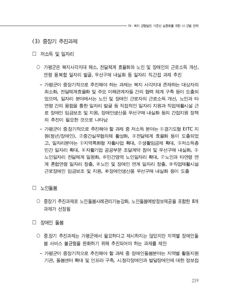 Ⅳ. 복지 균형발전 기준선 실효화를 위한 시·군별 전략 239 (3) 중장기 추진과제 □ 저소득 및 일자리 ○ 가평군은 복지사각지대 해소, 전달체계 효율화와 노인 및 장애인의 근로소득 개선, 연령 융․복합 일자리 발굴, 우선구매 내실화 등 일자리 직․간접 과제 추진 - 가평군이 중장기적으로 추진해야 하는 과제는 복지 사각지대 존재하는 대상자의 최소화, 전달체계효율화 및 주요 이해관계자들 간의 협력 체계 구축 등이 도출되 었으며, 일자리 분야에서는 노인 및 장애인 근로자의 근로소득 개선, 노인과 타 연령 간의 융합을 통한 일자리 발굴 등 직접적인 일자리 지원과 직업재활시설 근 로 장애인 임금보조 및 지원, 장애인생산품 우선구매 내실화 등의 간접지원 정책 의 추진이 필요한 것으로 나타남 - 가평군이 중․장기적으로 추진해야 할 과제 중 저소득 분야는 ①경기도형 EITC 지 원(청년/장애인), ②중간실무협의체 활성화, ③전달체계 효율화 등이 도출되었 고, 일자리분야는 ①지역특화형 자활사업 확대, ②생활임금제 확대, ③저소득층 민간 일자리 확대, ④자활기업 공공부문 조달계약 참여 및 우선구매 내실화, ⑤ 노인일자리 전달체계 일원화, ⑥민간영역 노인일자리 확대, ⑦노인과 타연령 연 계 혼합연령 일자리 창출, ⑧노인 및 장애인 연계 일자리 창출, ⑨직업재활시설 근로장애인 임금보조 및 지원, ⑩장애인생산품 우선구매 내실화 등이 도출 □ 노인돌봄 ○ 중장기 추진과제로 노인돌봄사례관리기능강화, 노인돌봄예방정보제공을 포함한 8개 과제가 선정됨 □ 장애인 돌봄 ○ 중․장기 추진과제는 가평군에서 필요하다고 제시하지는 않았지만 지역별 장애인돌 봄 서비스 불균형을 완화하기 위해 추진되어야 하는 과제를 제안 - 가평군이 중장기적으로 추진해야 할 과제 중 장애인돌봄분야는 지역별 활동지원 기관, 돌봄센터 확대 및 인프라 구축, 시․청각장애인과 발달장애인에 대한 정보접