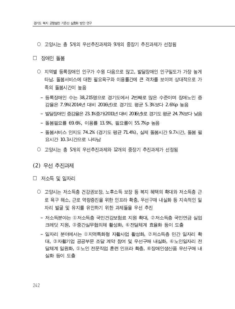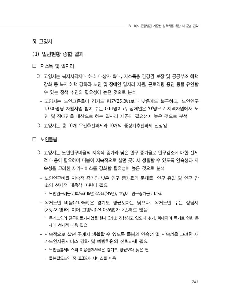 Ⅳ. 복지 균형발전 기준선 실효화를 위한 시·군별 전략 241 5) 고양시 (1) 일반현황 종합 결과 □ 저소득 및 일자리 ○ 고양시는 복지사각지대 해소 대상자 확대, 저소득층 건강권 보장 및 공공부조 혜택 강화 등 복지 혜택 강화와 노인 및 장애인 일자리 지원, 근로역량 증진 등을 유인할 수 있는 정책 추진의 필요성이 높은 것으로 분석 - 고양시는 노인고용율이 경기도 평균(25.3%)보다 낮음에도 불구하고, 노인인구 1,000명당 자활사업 참여 수는 0.61명이고, 장애인은 ‘0’명으로 지역차원에서 노 인 및 장애인을 대상으로 하는 일자리 제공의 필요성이 높은 것으로 분석 ○ 고양시는 총 10개 우선추진과제와 10개의 중장기추진과제 선정됨 □ 노인돌봄 ○ 고양시는 노인인구비율의 지속적 증가와 낮은 인구 증가율로 인구감소에 대한 선제 적 대응이 필요하며 더불어 지속적으로 살던 곳에서 생활할 수 있도록 연속성과 지 속성을 고려한 재가서비스를 강화할 필요성이 높은 것으로 분석 - 노인인구비율 지속적 증가와 낮은 인구 증가율의 문제를 인구 유입 및 인구 감 소의 선제적 대응책 마련이 필요 ・ 노인인구비율:10.9%(’16년)32.3%(’45년), 고양시 인구증가율:1.17% - 독거노인 비율(21.86%)은 경기도 평균보다는 낮으나, 독거노인 수는 성남시 (25,222명)에 이어 고양시(24,055명)가 2번째로 많음 ・ 독거노인의 친구만들기사업을 현재 2개소 진행하고 있으나 추가, 확대하여 독거로 인한 문 제에 선제적 대응 필요 - 지속적으로 살던 곳에서 생활할 수 있도록 돌봄의 연속성 및 지속성을 고려한 재 가노인지원서비스 강화 및 예방차원의 전략과제 필요 ・ 노인돌봄서비스의 이용률(9.9%)은 경기도 평균보다 낮은 편 ・ 돌봄필요노인 중 11.3%가 서비스를 이용