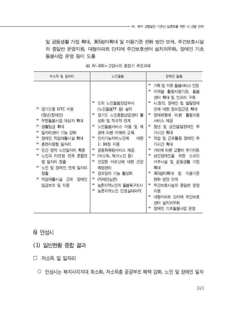 Ⅳ. 복지 균형발전 기준선 실효화를 위한 시·군별 전략 245 저소득 및 일자리 노인돌봄 장애인 돌봄  경기도형 EITC 지원 (청년/장애인)  무한돌봄사업 대상자 확대  생활임금 확대  일자리센터 기능 강화  장애인 직업재활시설 확대  훈련지원형 일자리  민간 영역 노인일자리 확충  노인과 타연령 연계 혼합연 령 일자리 창출  노인 및 장애인 연계 일자리 창출  직업재활시설 근로 장애인 임금보조 및 지원  도의 노인돌봄전담부서 (노인돌봄TF 등) 설치  경기도 노인종합상담센터 활 성화 및 적극적 연계  노인돌봄서비스 이용 및 제 공에 따른 이해와 교육  인지기능저하노인에 대한 1:1매칭 지원  공중목욕탕서비스 제공  (저소득, 독거노인 등)  건강한 어르신에 대한 건강 예방관리  경로당의 기능 활성화  (치매안심존)  농촌지역노인의 돌봄욕구조사  농촌지역노인 인권실태파악  가족 및 이웃 돌봄서비스 인정  지역별 활동지원기관, 돌봄 센터 확대 및 인프라 구축  시․청각, 장애인 및 발달장애 인에 대한 정보접근권 확대  장애유형에 따른 활동지원 서비스 제공  청년 및 성인발달장애인 추 가시간 확대  직업 및 근로활동 장애인 추 가시간 확대  거리에 따른 교통비 추가지원  성인장애인을 위한 소규모 거주시설 및 공동생활 가정 확대  365쉼터확대 및 이용기준 완화 방안 모색  주간보호시설의 종일반 운영 지원  대형아파트 단지에 주간보호 센터 설치의무화  장애인 기초돌봄사업 운영 <표 Ⅳ-100> 고양시의 중장기 추진과제 및 공동생활 가정 확대, 365쉼터확대 및 이용기준 완화 방안 모색, 주간보호시설 의 종일반 운영지원, 대형아파트 단지에 주간보호센터 설치의무화, 장애인 기초 돌봄사업 운영 등이 도출 6) 안성시 (1) 일반현황 종합 결과 □ 저소득 및 일자리 ○ 안성시는 복지사각지대 최소화, 저소득층 공공부조 혜택 강화, 노인 및 장애인 일자