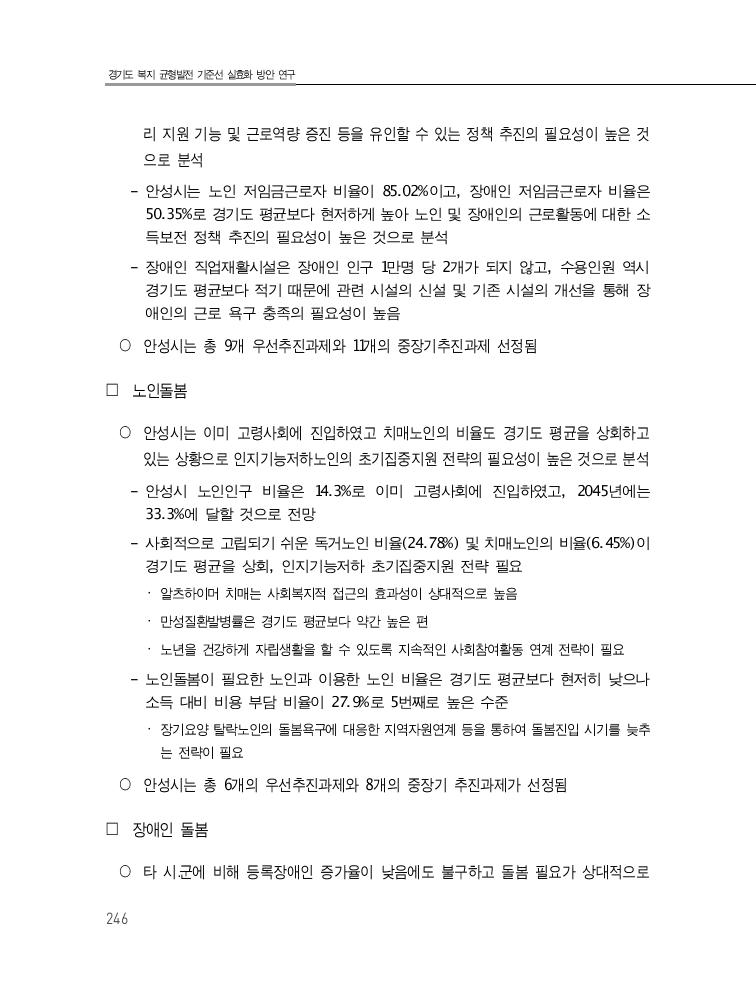 경기도 복지 균형발전 기준선 실효화 방안 연구 246 리 지원 기능 및 근로역량 증진 등을 유인할 수 있는 정책 추진의 필요성이 높은 것 으로 분석 - 안성시는 노인 저임금근로자 비율이 85.02%이고, 장애인 저임금근로자 비율은 50.35%로 경기도 평균보다 현저하게 높아 노인 및 장애인의 근로활동에 대한 소 득보전 정책 추진의 필요성이 높은 것으로 분석 - 장애인 직업재활시설은 장애인 인구 1만명 당 2개가 되지 않고, 수용인원 역시 경기도 평균보다 적기 때문에 관련 시설의 신설 및 기존 시설의 개선을 통해 장 애인의 근로 욕구 충족의 필요성이 높음 ○ 안성시는 총 9개 우선추진과제와 11개의 중장기추진과제 선정됨 □ 노인돌봄 ○ 안성시는 이미 고령사회에 진입하였고 치매노인의 비율도 경기도 평균을 상회하고 있는 상황으로 인지기능저하노인의 초기집중지원 전략의 필요성이 높은 것으로 분석 - 안성시 노인인구 비율은 14.3%로 이미 고령사회에 진입하였고, 2045년에는 33.3%에 달할 것으로 전망 - 사회적으로 고립되기 쉬운 독거노인 비율(24.78%) 및 치매노인의 비율(6.45%)이 경기도 평균을 상회, 인지기능저하 초기집중지원 전략 필요 ・ 알츠하이머 치매는 사회복지적 접근의 효과성이 상대적으로 높음 ・ 만성질환발병률은 경기도 평균보다 약간 높은 편 ・ 노년을 건강하게 자립생활을 할 수 있도록 지속적인 사회참여활동 연계 전략이 필요 - 노인돌봄이 필요한 노인과 이용한 노인 비율은 경기도 평균보다 현저히 낮으나 소득 대비 비용 부담 비율이 27.9%로 5번째로 높은 수준 ・ 장기요양 탈락노인의 돌봄욕구에 대응한 지역자원연계 등을 통하여 돌봄진입 시기를 늦추 는 전략이 필요 ○ 안성시는 총 6개의 우선추진과제와 8개의 중장기 추진과제가 선정됨 □ 장애인 돌봄 ○ 타 시․군에 비해 등록장애인 증가율이 낮음에도 불구하고 돌봄 필요가 상대적으로