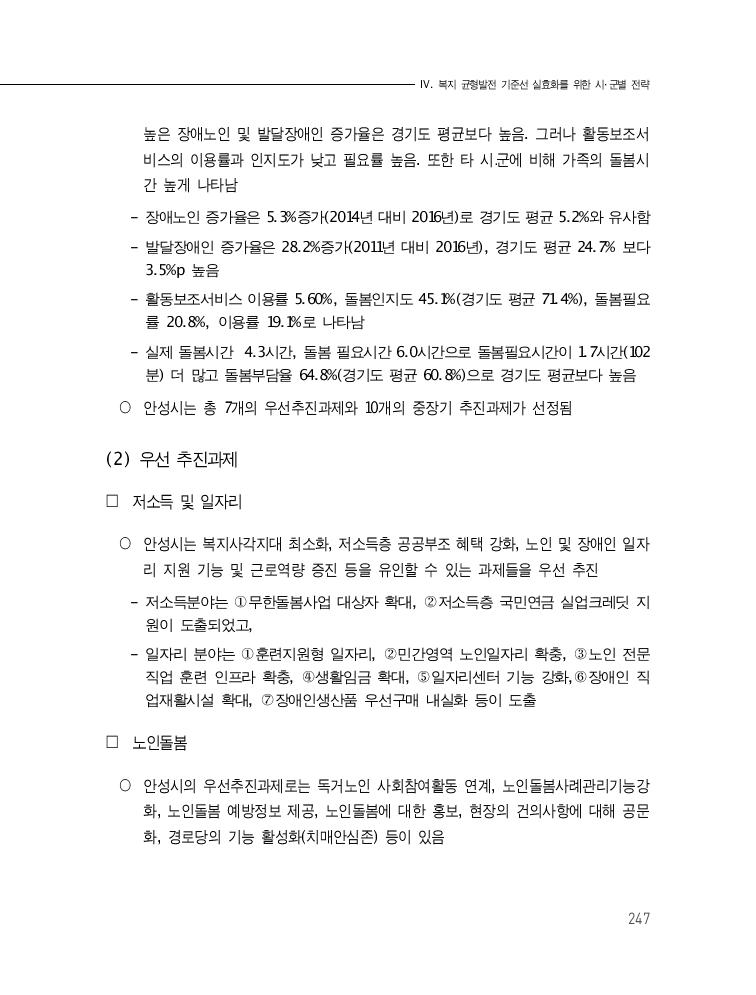 Ⅳ. 복지 균형발전 기준선 실효화를 위한 시·군별 전략 247 높은 장애노인 및 발달장애인 증가율은 경기도 평균보다 높음. 그러나 활동보조서 비스의 이용률과 인지도가 낮고 필요률 높음. 또한 타 시․군에 비해 가족의 돌봄시 간 높게 나타남 - 장애노인 증가율은 5.3%증가(2014년 대비 2016년)로 경기도 평균 5.2%와 유사함 - 발달장애인 증가율은 28.2%증가(2011년 대비 2016년), 경기도 평균 24.7% 보다 3.5%p 높음 - 활동보조서비스 이용률 5.60%, 돌봄인지도 45.1%(경기도 평균 71.4%), 돌봄필요 률 20.8%, 이용률 19.1%로 나타남 - 실제 돌봄시간 4.3시간, 돌봄 필요시간 6.0시간으로 돌봄필요시간이 1.7시간(102 분) 더 많고 돌봄부담율 64.8%(경기도 평균 60.8%)으로 경기도 평균보다 높음 ○ 안성시는 총 7개의 우선추진과제와 10개의 중장기 추진과제가 선정됨 (2) 우선 추진과제 □ 저소득 및 일자리 ○ 안성시는 복지사각지대 최소화, 저소득층 공공부조 혜택 강화, 노인 및 장애인 일자 리 지원 기능 및 근로역량 증진 등을 유인할 수 있는 과제들을 우선 추진 - 저소득분야는 ①무한돌봄사업 대상자 확대, ②저소득층 국민연금 실업크레딧 지 원이 도출되었고, - 일자리 분야는 ①훈련지원형 일자리, ②민간영역 노인일자리 확충, ③노인 전문 직업 훈련 인프라 확충, ④생활임금 확대, ⑤일자리센터 기능 강화,⑥장애인 직 업재활시설 확대, ⑦장애인생산품 우선구매 내실화 등이 도출 □ 노인돌봄 ○ 안성시의 우선추진과제로는 독거노인 사회참여활동 연계, 노인돌봄사례관리기능강 화, 노인돌봄 예방정보 제공, 노인돌봄에 대한 홍보, 현장의 건의사항에 대해 공문 화, 경로당의 기능 활성화(치매안심존) 등이 있음