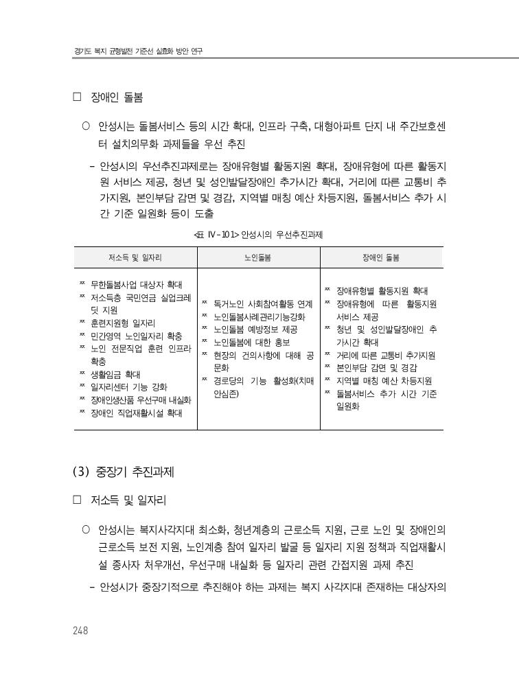 경기도 복지 균형발전 기준선 실효화 방안 연구 248 저소득 및 일자리 노인돌봄 장애인 돌봄  무한돌봄사업 대상자 확대  저소득층 국민연금 실업크레 딧 지원  훈련지원형 일자리  민간영역 노인일자리 확충  노인 전문직업 훈련 인프라 확충  생활임금 확대  일자리센터 기능 강화  장애인생산품 우선구매 내실화  장애인 직업재활시설 확대  독거노인 사회참여활동 연계  노인돌봄사례관리기능강화  노인돌봄 예방정보 제공  노인돌봄에 대한 홍보  현장의 건의사항에 대해 공 문화  경로당의 기능 활성화(치매 안심존)  장애유형별 활동지원 확대  장애유형에 따른 활동지원 서비스 제공  청년 및 성인발달장애인 추 가시간 확대  거리에 따른 교통비 추가지원  본인부담 감면 및 경감  지역별 매칭 예산 차등지원  돌봄서비스 추가 시간 기준 일원화 <표 Ⅳ-101> 안성시의 우선추진과제 □ 장애인 돌봄 ○ 안성시는 돌봄서비스 등의 시간 확대, 인프라 구축, 대형아파트 단지 내 주간보호센 터 설치의무화 과제들을 우선 추진 - 안성시의 우선추진과제로는 장애유형별 활동지원 확대, 장애유형에 따른 활동지 원 서비스 제공, 청년 및 성인발달장애인 추가시간 확대, 거리에 따른 교통비 추 가지원, 본인부담 감면 및 경감, 지역별 매칭 예산 차등지원, 돌봄서비스 추가 시 간 기준 일원화 등이 도출 (3) 중장기 추진과제 □ 저소득 및 일자리 ○ 안성시는 복지사각지대 최소화, 청년계층의 근로소득 지원, 근로 노인 및 장애인의 근로소득 보전 지원, 노인계층 참여 일자리 발굴 등 일자리 지원 정책과 직업재활시 설 종사자 처우개선, 우선구매 내실화 등 일자리 관련 간접지원 과제 추진 - 안성시가 중장기적으로 추진해야 하는 과제는 복지 사각지대 존재하는 대상자의