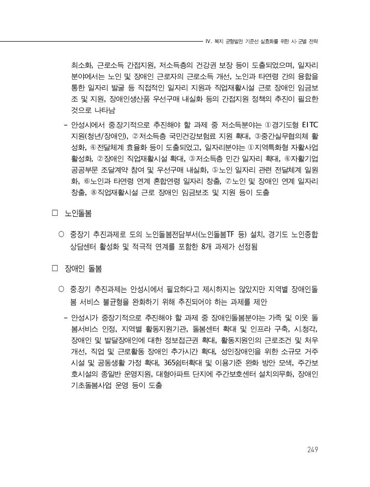 Ⅳ. 복지 균형발전 기준선 실효화를 위한 시·군별 전략 249 최소화, 근로소득 간접지원, 저소득층의 건강권 보장 등이 도출되었으며, 일자리 분야에서는 노인 및 장애인 근로자의 근로소득 개선, 노인과 타연령 간의 융합을 통한 일자리 발굴 등 직접적인 일자리 지원과 직업재활시설 근로 장애인 임금보 조 및 지원, 장애인생산품 우선구매 내실화 등의 간접지원 정책의 추진이 필요한 것으로 나타남 - 안성시에서 중․장기적으로 추진해야 할 과제 중 저소득분야는 ①경기도형 EITC 지원(청년/장애인), ②저소득층 국민건강보험료 지원 확대, ③중간실무협의체 활 성화, ④전달체계 효율화 등이 도출되었고, 일자리분야는 ①지역특화형 자활사업 활성화, ②장애인 직업재활시설 확대, ③저소득층 민간 일자리 확대, ④자활기업 공공부문 조달계약 참여 및 우선구매 내실화, ⑤노인 일자리 관련 전달체계 일원 화, ⑥노인과 타연령 연계 혼합연령 일자리 창출, ⑦노인 및 장애인 연계 일자리 창출, ⑧직업재활시설 근로 장애인 임금보조 및 지원 등이 도출 □ 노인돌봄 ○ 중장기 추진과제로 도의 노인돌봄전담부서(노인돌봄TF 등) 설치, 경기도 노인종합 상담센터 활성화 및 적극적 연계를 포함한 8개 과제가 선정됨 □ 장애인 돌봄 ○ 중․장기 추진과제는 안성시에서 필요하다고 제시하지는 않았지만 지역별 장애인돌 봄 서비스 불균형을 완화하기 위해 추진되어야 하는 과제를 제안 - 안성시가 중장기적으로 추진해야 할 과제 중 장애인돌봄분야는 가족 및 이웃 돌 봄서비스 인정, 지역별 활동지원기관, 돌봄센터 확대 및 인프라 구축, 시․청각, 장애인 및 발달장애인에 대한 정보접근권 확대, 활동지원인의 근로조건 및 처우 개선, 직업 및 근로활동 장애인 추가시간 확대, 성인장애인을 위한 소규모 거주 시설 및 공동생활 가정 확대, 365쉼터확대 및 이용기준 완화 방안 모색, 주간보 호시설의 종일반 운영지원, 대형아파트 단지에 주간보호센터 설치의무화, 장애인 기초돌봄사업 운영 등이 도출