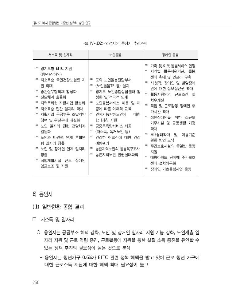 경기도 복지 균형발전 기준선 실효화 방안 연구 250 저소득 및 일자리 노인돌봄 장애인 돌봄  경기도형 EITC 지원 (청년/장애인)  저소득층 국민건강보험료 지 원 확대  중간실무협의체 활성화  전달체계 효율화  지역특화형 자활사업 활성화  저소득층 민간 일자리 확대  자활기업 공공부문 조달계약 참여 및 우선구매 내실화  노인 일자리 관련 전달체계 일원화  노인과 타연령 연계 혼합연 령 일자리 창출  노인 및 장애인 연계 일자리 창출  직업재활시설 근로 장애인 임금보조 및 지원  도의 노인돌봄전담부서  (노인돌봄TF 등) 설치  경기도 노인종합상담센터 활 성화 및 적극적 연계  노인돌봄서비스 이용 및 제 공에 따른 이해와 교육  인지기능저하노인에 대한 1:1매칭 지원  공중목욕탕서비스 제공  (저소득, 독거노인 등)  건강한 어르신에 대한 건강 예방관리  농촌지역노인의 돌봄욕구조사  농촌지역노인 인권실태파악  가족 및 이웃 돌봄서비스 인정  지역별 활동지원기관, 돌봄 센터 확대 및 인프라 구축  시․청각, 장애인 및 발달장애 인에 대한 정보접근권 확대  활동지원인의 근로조건 및 처우개선  직업 및 근로활동 장애인 추 가시간 확대  성인장애인을 위한 소규모 거주시설 및 공동생활 가정 확대  365쉼터확대 및 이용기준 완화 방안 모색  주간보호시설의 종일반 운영 지원  대형아파트 단지에 주간보호 센터 설치의무화  장애인 기초돌봄사업 운영 <표 Ⅳ-102> 안성시의 중장기 추진과제 6) 용인시 (1) 일반현황 종합 결과 □ 저소득 및 일자리 ○ 용인시는 공공부조 혜택 강화, 노인 및 장애인 일자리 지원 기능 강화, 노인계층 일 자리 지원 및 근로 역량 증진, 근로활동에 지원을 통한 실질 소득 증진을 유인할 수 있는 정책 추진의 필요성이 높은 것으로 분석 - 용인시는 청년가구 0.6%가 EITC 관련 정책 혜택을 받고 있어 근로 청년 가구에 대한 근로소득 지원에 대한 혜택 확대 필요성이 높고