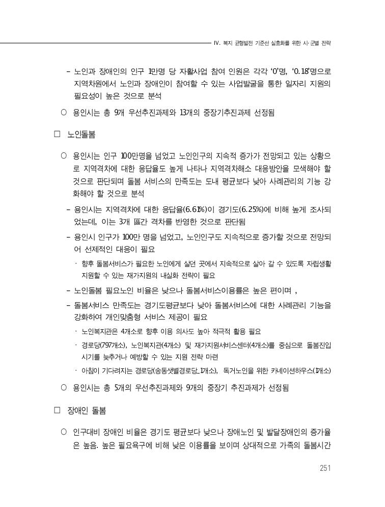 Ⅳ. 복지 균형발전 기준선 실효화를 위한 시·군별 전략 251 - 노인과 장애인의 인구 1만명 당 자활사업 참여 인원은 각각 ‘0’명, ‘0.18’명으로 지역차원에서 노인과 장애인이 참여할 수 있는 사업발굴을 통한 일자리 지원의 필요성이 높은 것으로 분석 ○ 용인시는 총 9개 우선추진과제와 13개의 중장기추진과제 선정됨 □ 노인돌봄 ○ 용인시는 인구 100만명을 넘었고 노인인구의 지속적 증가가 전망되고 있는 상황으 로 지역격차에 대한 응답율도 높게 나타나 지역격차해소 대응방안을 모색해야 할 것으로 판단되며 돌봄 서비스의 만족도는 도내 평균보다 낮아 사례관리의 기능 강 화해야 할 것으로 분석 - 용인시는 지역격차에 대한 응답율(6.61%)이 경기도(6.25%)에 비해 높게 조사되 었는데, 이는 3개 區간 격차를 반영한 것으로 판단됨 - 용인시 인구가 100만 명을 넘었고, 노인인구도 지속적으로 증가할 것으로 전망되 어 선제적인 대응이 필요 ・ 향후 돌봄서비스가 필요한 노인에게 살던 곳에서 지속적으로 살아 갈 수 있도록 자립생활 지원할 수 있는 재가지원의 내실화 전략이 필요 - 노인돌봄 필요노인 비율은 낮으나 돌봄서비스이용률은 높은 편이며 , - 돌봄서비스 만족도는 경기도평균보다 낮아 돌봄서비스에 대한 사례관리 기능을 강화하여 개인맞춤형 서비스 제공이 필요 ・ 노인복지관은 4개소로 향후 이용 의사도 높아 적극적 활용 필요 ・ 경로당(797개소), 노인복지관(4개소) 및 재가지원서비스센터(4개소)를 중심으로 돌봄진입 시기를 늦추거나 예방할 수 있는 지원 전략 마련 ・ 아침이 기다려지는 경로당(송동샛별경로당_1개소), 독거노인을 위한 카네이션하우스(1개소) ○ 용인시는 총 5개의 우선추진과제와 9개의 중장기 추진과제가 선정됨 □ 장애인 돌봄 ○ 인구대비 장애인 비율은 경기도 평균보다 낮으나 장애노인 및 발달장애인의 증가율 은 높음. 높은 필요욕구에 비해 낮은 이용률을 보이며 상대적으로 가족의 돌봄시간