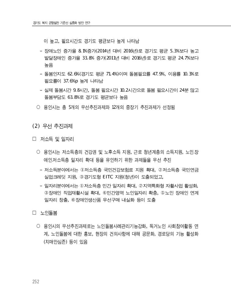 경기도 복지 균형발전 기준선 실효화 방안 연구 252 이 높고, 필요시간도 경기도 평균보다 높게 나타남 - 장애노인 증가율 8.1%증가(2014년 대비 2016년)로 경기도 평균 5.3%보다 높고 발달장애인 증가율 33.8% 증가(2011년 대비 2016년)로 경기도 평균 24.7%보다 높음 - 돌봄인지도 62.6%(경기도 평균 71.4%)이며 돌봄필요률 47.9%, 이용률 10.3%로 필요률이 37.6%p 높게 나타남 - 실제 돌봄시간 9.8시간, 돌봄 필요시간 10.2시간으로 돌봄 필요시간이 24분 많고 돌봄부담도 63.8%로 경기도 평균보다 높음 ○ 용인시는 총 5개의 우선추진과제와 12개의 중장기 추진과제가 선정됨 (2) 우선 추진과제 □ 저소득 및 일자리 ○ 용인시는 저소득층의 건강권 및 노후소득 지원, 근로 청년계층의 소득지원, 노인․장 애인․저소득층 일자리 확대 등을 유인하기 위한 과제들을 우선 추진 - 저소득분야에서는 ①저소득층 국민건강보험료 지원 확대, ②저소득층 국민연금 실업크레딧 지원, ③경기도형 EITC 지원(청년)이 도출되었고, - 일자리분야에서는 ①저소득층 민간 일자리 확대, ②지역특화형 자활사업 활성화, ③장애인 직업재활시설 확대, ④민간영역 노인일자리 확충, ⑤노인 장애인 연계 일자리 창출, ⑥장애인생산품 우선구매 내실화 등이 도출 □ 노인돌봄 ○ 용인시의 우선추진과제로는 노인돌봄사례관리기능강화, 독거노인 사회참여활동 연 계, 노인돌봄에 대한 홍보, 현장의 건의사항에 대해 공문화, 경로당의 기능 활성화 (치매안심존) 등이 있음