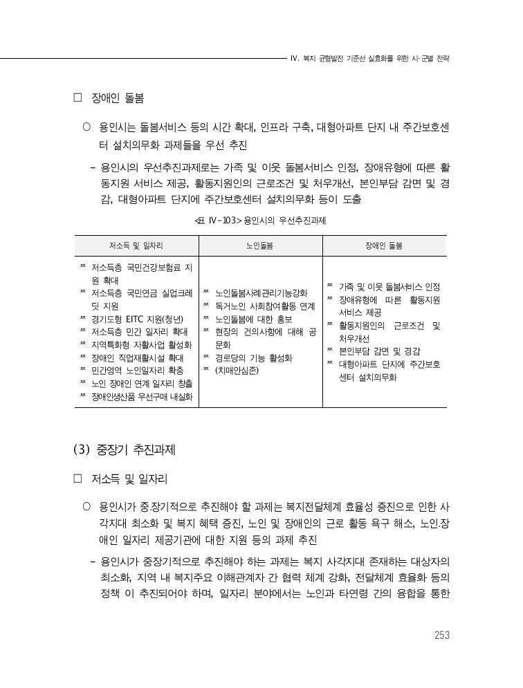 Ⅳ. 복지 균형발전 기준선 실효화를 위한 시·군별 전략 253 저소득 및 일자리 노인돌봄 장애인 돌봄  저소득층 국민건강보험료 지 원 확대  저소득층 국민연금 실업크레 딧 지원  경기도형 EITC 지원(청년)  저소득층 민간 일자리 확대  지역특화형 자활사업 활성화  장애인 직업재활시설 확대  민간영역 노인일자리 확충  노인 장애인 연계 일자리 창출  장애인생산품 우선구매 내실화  노인돌봄사례관리기능강화  독거노인 사회참여활동 연계  노인돌봄에 대한 홍보  현장의 건의사항에 대해 공 문화  경로당의 기능 활성화  (치매안심존)  가족 및 이웃 돌봄서비스 인정  장애유형에 따른 활동지원 서비스 제공  활동지원인의 근로조건 및 처우개선  본인부담 감면 및 경감  대형아파트 단지에 주간보호 센터 설치의무화 <표 Ⅳ-103> 용인시의 우선추진과제 □ 장애인 돌봄 ○ 용인시는 돌봄서비스 등의 시간 확대, 인프라 구축, 대형아파트 단지 내 주간보호센 터 설치의무화 과제들을 우선 추진 - 용인시의 우선추진과제로는 가족 및 이웃 돌봄서비스 인정, 장애유형에 따른 활 동지원 서비스 제공, 활동지원인의 근로조건 및 처우개선, 본인부담 감면 및 경 감, 대형아파트 단지에 주간보호센터 설치의무화 등이 도출 (3) 중장기 추진과제 □ 저소득 및 일자리 ○ 용인시가 중․장기적으로 추진해야 할 과제는 복지전달체계 효율성 증진으로 인한 사 각지대 최소화 및 복지 혜택 증진, 노인 및 장애인의 근로 활동 욕구 해소, 노인․장 애인 일자리 제공기관에 대한 지원 등의 과제 추진 - 용인시가 중장기적으로 추진해야 하는 과제는 복지 사각지대 존재하는 대상자의 최소화, 지역 내 복지주요 이해관계자 간 협력 체계 강화, 전달체계 효율화 등의 정책 이 추진되어야 하며, 일자리 분야에서는 노인과 타연령 간의 융합을 통한