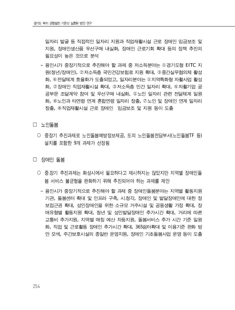경기도 복지 균형발전 기준선 실효화 방안 연구 254 일자리 발굴 등 직접적인 일자리 지원과 직업재활시설 근로 장애인 임금보조 및 지원, 장애인생산품 우선구매 내실화, 장애인 근로기회 확대 등의 정책 추진의 필요성이 높은 것으로 분석 - 용인시가 중장기적으로 추진해야 할 과제 중 저소득분야는 ①경기도형 EITC 지 원(청년/장애인), ②저소득층 국민건강보험료 지원 확대, ③중간실무협의체 활성 화, ④전달체계 효율화가 도출되었고, 일자리분야는 ①지역특화형 자활사업 활성 화, ②장애인 직업재활시설 확대, ③저소득층 민간 일자리 확대, ④자활기업 공 공부문 조달계약 참여 및 우선구매 내실화, ⑤노인 일자리 관련 전달체계 일원 화, ⑥노인과 타연령 연계 혼합연령 일자리 창출, ⑦노인 및 장애인 연계 일자리 창출, ⑧직업재활시설 근로 장애인 임금보조 및 지원 등이 도출 □ 노인돌봄 ○ 중장기 추진과제로 노인돌봄예방정보제공, 도의 노인돌봄전담부서(노인돌봄TF 등) 설치를 포함한 9개 과제가 선정됨 □ 장애인 돌봄 ○ 중․장기 추진과제는 화성시에서 필요하다고 제시하지는 않았지만 지역별 장애인돌 봄 서비스 불균형을 완화하기 위해 추진되어야 하는 과제를 제안 - 용인시가 중장기적으로 추진해야 할 과제 중 장애인돌봄분야는 지역별 활동지원 기관, 돌봄센터 확대 및 인프라 구축, 시․청각, 장애인 및 발달장애인에 대한 정 보접근권 확대, 성인장애인을 위한 소규모 거주시설 및 공동생활 가정 확대, 장 애유형별 활동지원 확대, 청년 및 성인발달장애인 추가시간 확대, 거리에 따른 교통비 추가지원, 지역별 매칭 예산 차등지원, 돌봄서비스 추가 시간 기준 일원 화, 직업 및 근로활동 장애인 추가시간 확대, 365쉼터확대 및 이용기준 완화 방 안 모색, 주간보호시설의 종일반 운영지원, 장애인 기초돌봄사업 운영 등이 도출
